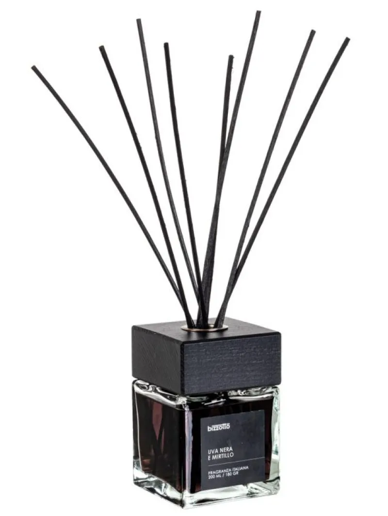 UVA NERA E MIRTILLO FRAGRANZA PER AMBIENTI CON 6 BASTONCINI NERI (H 30 CM). PROFUMO APPARTENENTE ALLA FAMIGLIA DEI FRUTTATI. BOTTIGLIA IN VETRO, FORMATO 200 ML. CONTROTAPPO IN PLASTICA E TAPPO DECORATIVO IN LEGNO NERO. AREA DI COPERTURA 40 MQ. LIQUIDO E VAPORI FACILMENTE INFIAMMABILI.