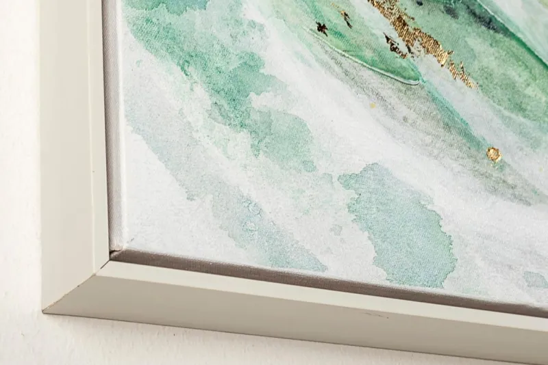 STAMPA DIPINTA A MANO SU TELA CON APPLICAZIONI FOGLI DORATI, STRUTTURA IN LEGNO DI PINO. CORNICE IN PLASTICA.
