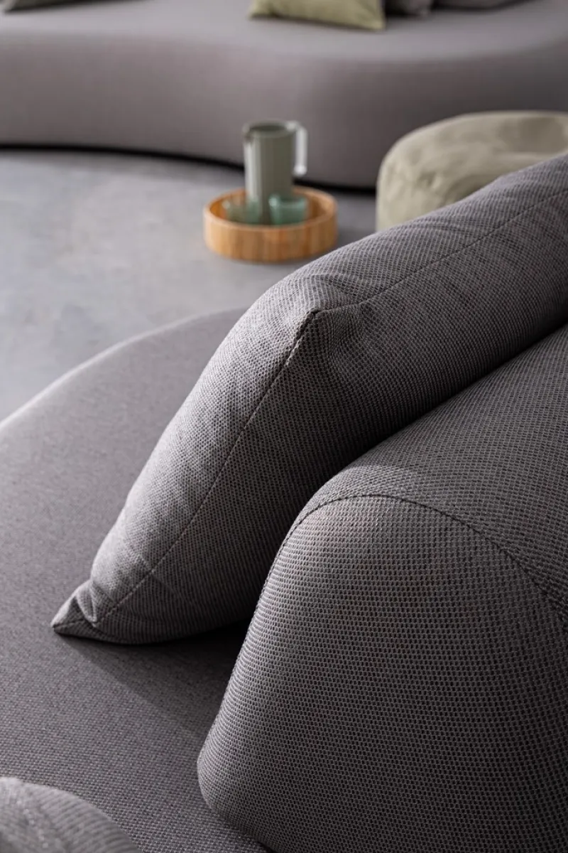 DIVANO CON STRUTTURA IN ALLUMINIO. SCHIENALI REMOVIBILI CON STRUTTURA IN ACCIAIO, GALVANIZZATA A CALDO E VERNICIATA A POLVERE (POLIESTERE). SCHIENALI E CUSCINI SFODERABILI IN TESSUTO PER ESTERNO OLEFIN (100% POLIPROPILENE, 285GR/M2), IDROREPELLENTE E RESISTENTE AI RAGGI UV (GRADO 7), IMPERMEABILIZZATO INTERNAMENTE CON RIVESTIMENTO IN TESSUTO (POLIURETANO). IMBOTTITURA IN SCHIUMA POLIURETANICA, DENSITA’ SEDUTA 38KG/M3, SCHIENALI 20KG/M3. ARTICOLO COMPOSTO DA: N °1 DIVANO, N°2 SCHIENALI MEZZALUNA, N°2 CUSCINETTI.
