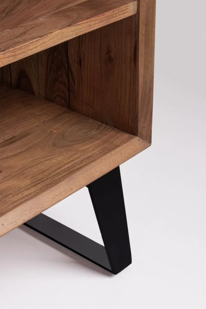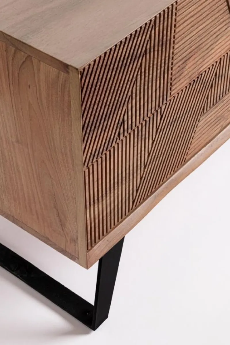 STRUTTURA IN LEGNO DI ACACIA, SCHIENALI IN COMPENSATO. FRONTALI ANTE INTARSIATI E LAVORATI A MANO. FINITURA ACRILICA PROTETTIVA. MANIGLIE E GAMBE IN ACCIAIO. GAMBE DA ASSEMBLARE.