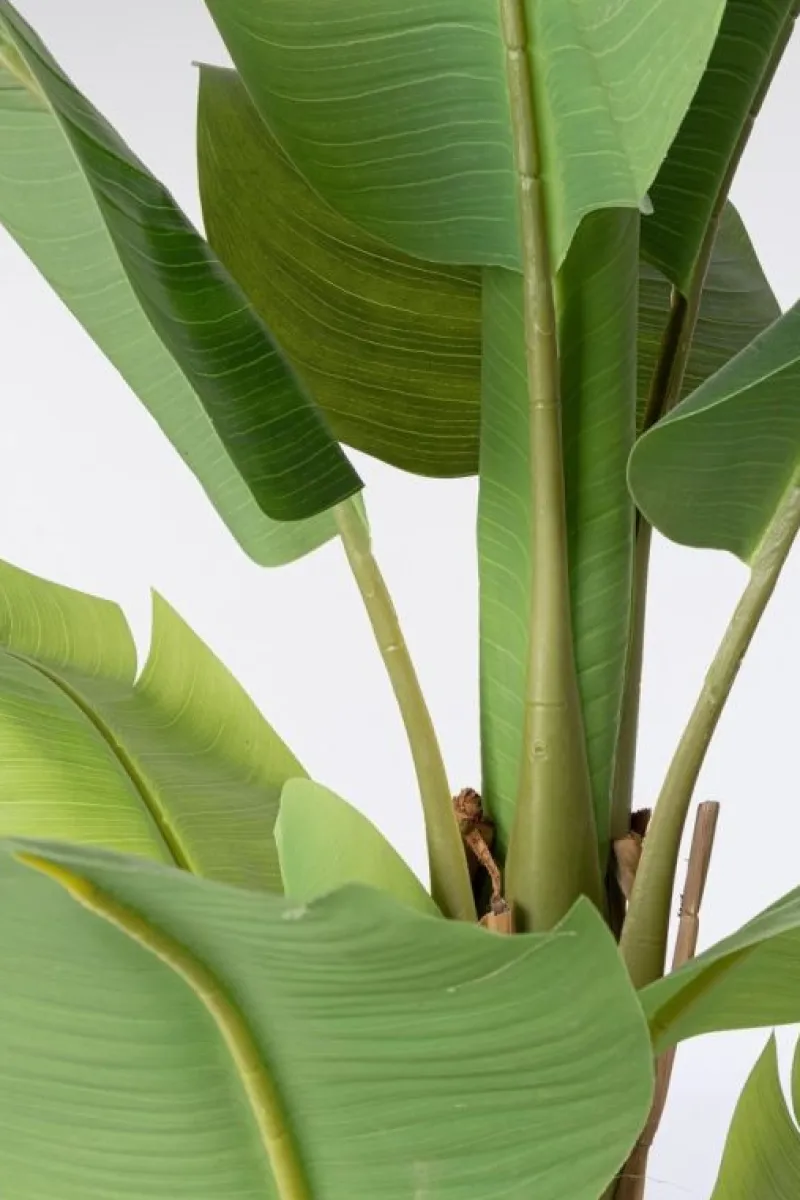 FOGLIE IN GOMMA, TRONCO IN LEGNO E CORTECCIA DI BANANO E POLIURETANO, METALLO, VASO IN PLASTICA, CONTENUTO VASO IN CEMENTO PER GARANTIRE STABILITA’.