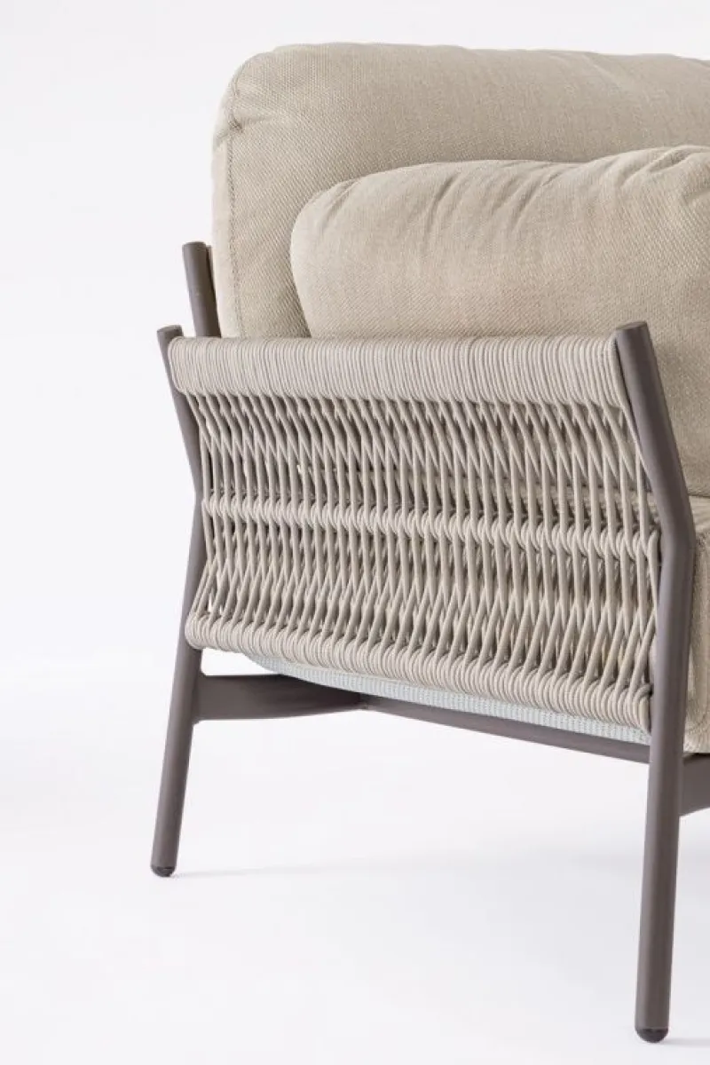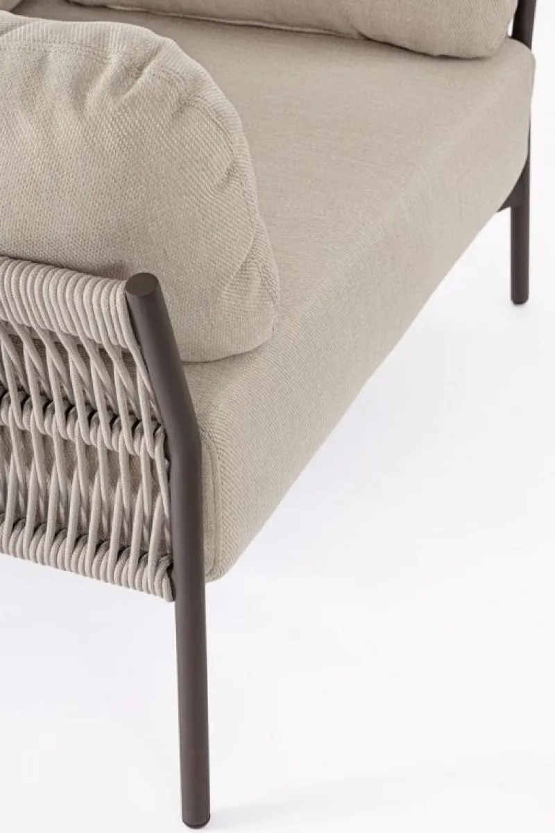 STRUTTURA IN ALLUMINIO VERNICIATO A POLVERE (POLIESTERE). INTRECCIO IN CORDA OLEFIN (100% POLIPROPILENE). CUSCINI SEDUTA E SCHIENALE SFODERABILI IN TESSUTO IDROREPELLENTE OLEFIN (100% POLIPROPILENE).