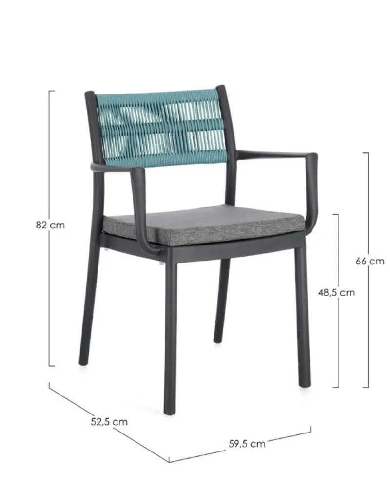 POLIPROPILENE (PP), RESISTENTE AI RAGGI UV. SCHIENALE CON INTRECCIO IN CORDA DI POLIESTERE. CUSCINO SEDUTA SFODERABILE CON TESSUTO IDROREPELLENTE POLIESTERE. IMPILABILE.