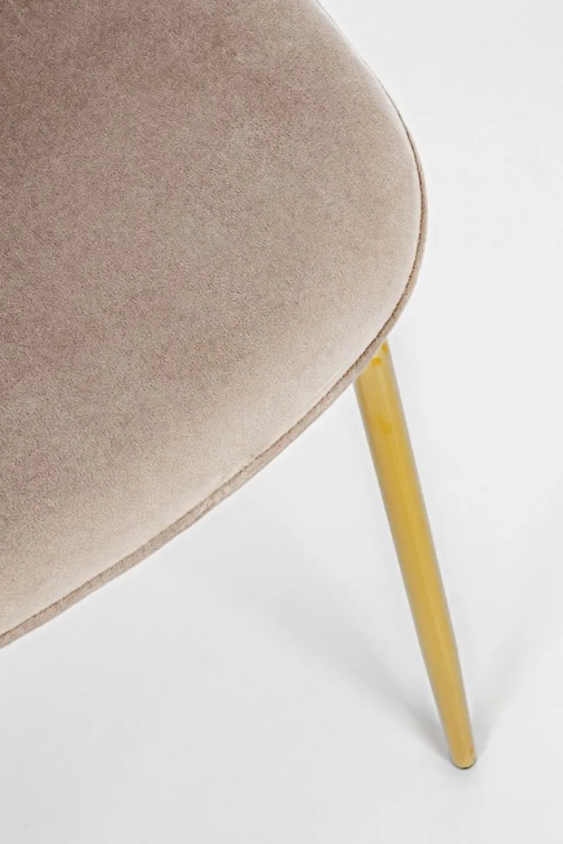 GAMBE IN TUBOLARE DI ACCIAIO CON CROMATURA DORATA. SCHIENALE E SEDUTA IMBOTTITI IN SCHIUMA POLIURETANICA E RIVESTITI IN VELLUTO (100% POLIESTERE). GAMBE DA ASSEMBLARE.