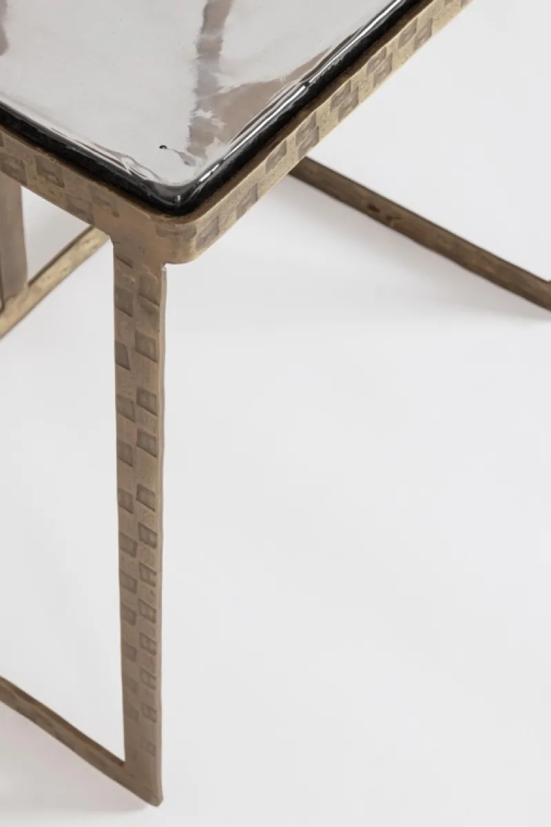 ACCIAIO CON FINITURA MARTELLATA, PLACCATA ED ANTICATA. PIANO IN VETRO NATURALE LAVORATO A MANO (SPESSORE 15-18MM). LE FORME ORIGINALI CREATE DAL VETRO SONO SOLO INDICATIVE, TUTTI I PRODOTTI SARANNO DIVERSI L’UNO DALL’ALTRO, CON MISURE E COLORAZIONI LEGGERMENTE DIFFERENTI.