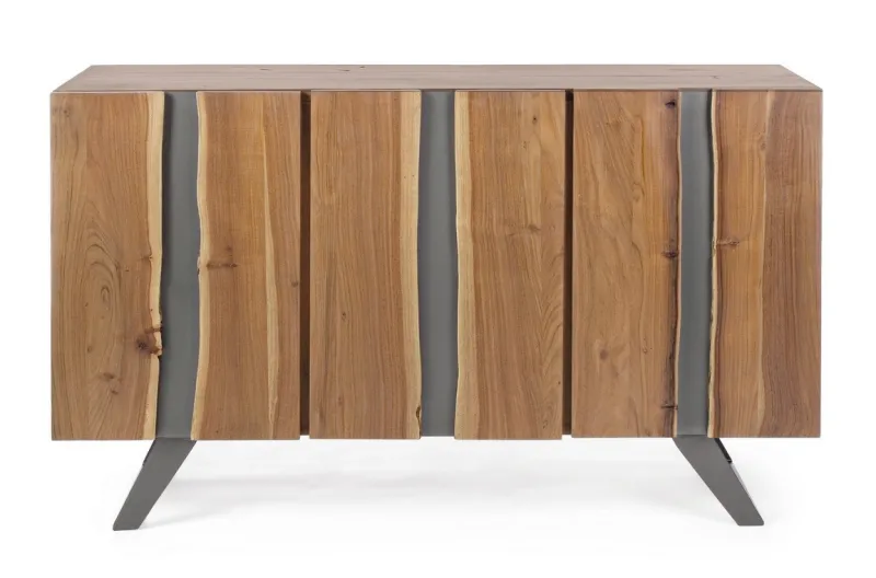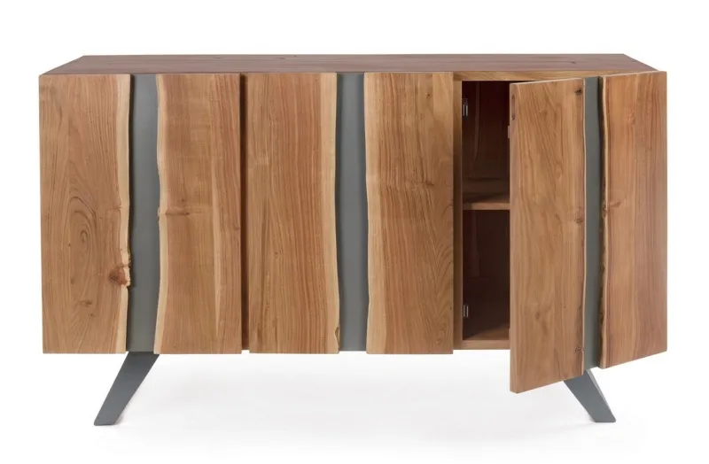 STRUTTURA IN LEGNO DI ACACIA, GAMBE IN ACCIAIO VERNICIATO A POLVERE EPOSSIDICA. PORTE CON INSERTI IN METALLO. FINITURA A BASE DI VERNICE POLIURETANICA. VANO PORTA COMPRENSIVO DI MENSOLA. GAMBE DA ASSEMBLARE.
