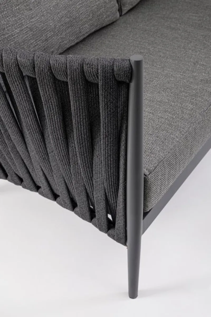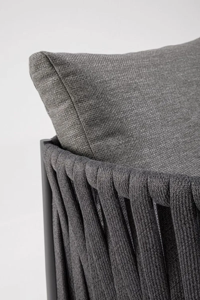 STRUTTURA IN ALLUMINIO VERNICIATO A POLVERE (POLIESTERE). INTRECCIO CON CORDE IN TETORON (100% POLIESTERE) CON IMBOTTITURA IN GOMMA (POLIETILENE). CUSCINI SEDUTA E SCHIENALE SFODERABILI IN TESSUTO IDROREPELLENTE OLEFIN (100% POLIPROPILENE).