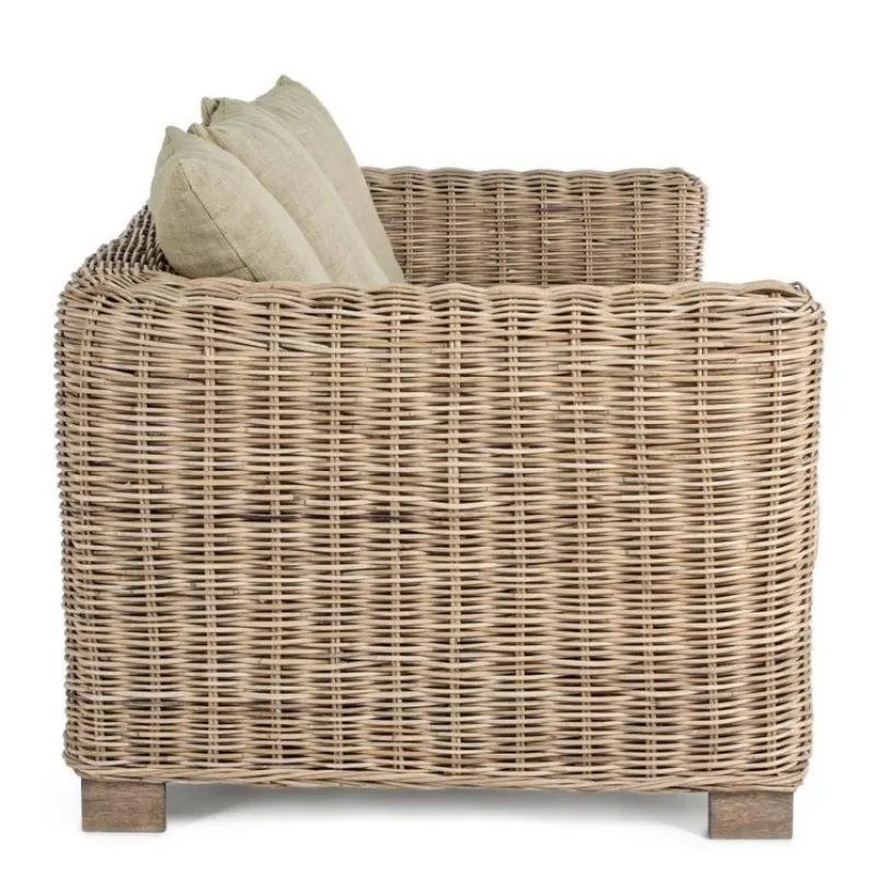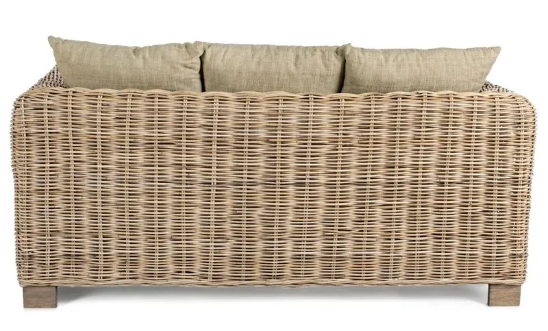 STRUTTURA IN LEGNO DI MANGO E RATTAN, INTRECCIO IN KUBU, FINITURA NATURALE A BASE DI NITROCELLULOSA. CUSCINI SFODERABILI CON TESSUTO PER USO INTERNO (55% COTONE, 45% POLIESTERE). SI RACCOMANDA DI NON ESPORRE IL MOBILE ALLA LUCE DIRETTA DEL SOLE E ALLE INTEMPERIE. IMBALLO SENZA CARTONE.