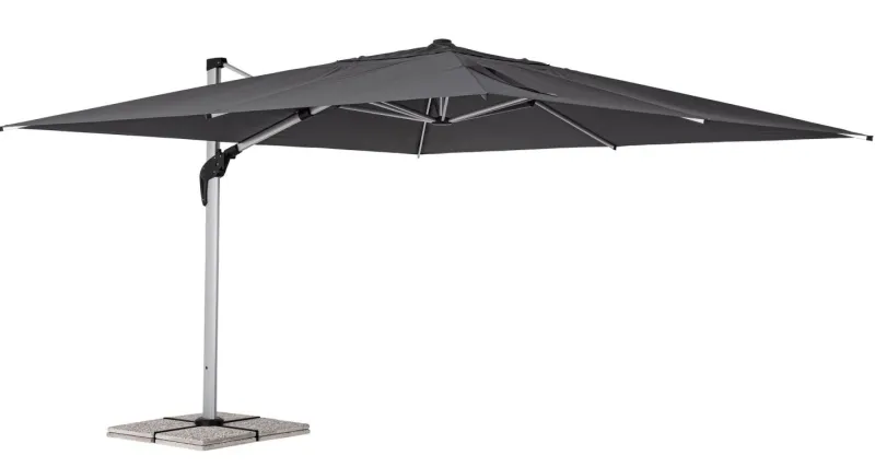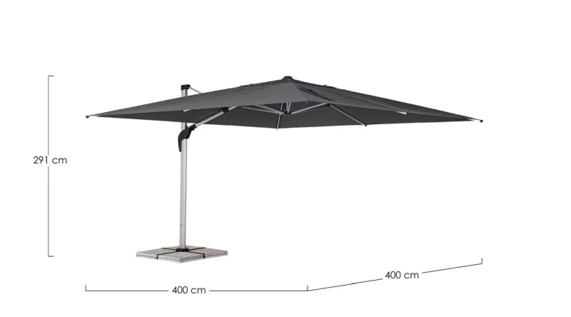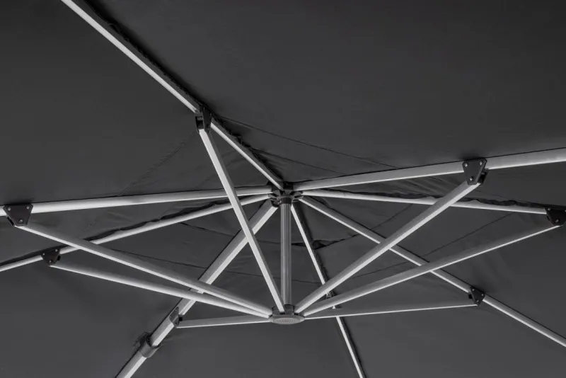 STRUTTURA IN ALLUMINIO ANODIZZATO. PALO 102×65.5MM. 8 STECCHE 30X18.5MM. TELO COLOR GRIGIO SCURO IN POLIESTERE 250GR/M2 CON RIVESTIMENTO IN PA (POLIAMMIDE) CON CAMINO ANTIVENTO. BASE A CROCE IN ACCIAIO. PALO GIREVOLE 360° MANUALMENTE. INCLINAZIONE VERTICALE CON IMPUGNATURA A 6 POSIZIONI. DOTATO DI SISTEMA PER INCLINAZIONE OMBRELLO DESTRA-SINISTRA. COMPRENSIVO DI