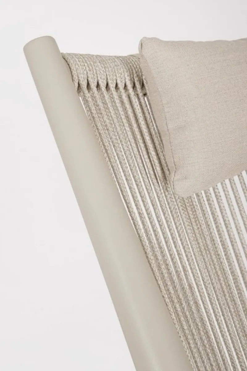 STRUTTURA IN ALLUMINIO VERNICIATO A POLVERE (POLIESTERE), INTRECCIO CON CORDE IN POLIESTERE (IDROREPELLENTI, RESISTENTI RAGGI UV). CUSCINI SFODERABILI IN TESSUTO IDROREPELLENTE ACRILICO (280GR/M2). DA ASSEMBLARE.