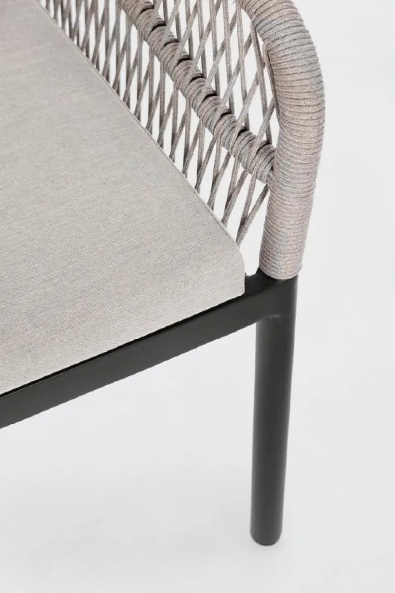 STRUTTURA IN ALLUMINIO VERNICIATA A POLVERE (POLIESTERE). INTRECCIO PER ESTERNO IN CORDA POLIESTERE. CUSCINI SFODERABILI IN TESSUTO IDROREPELLENTE 100% POLIESTERE. IMPILABILE.