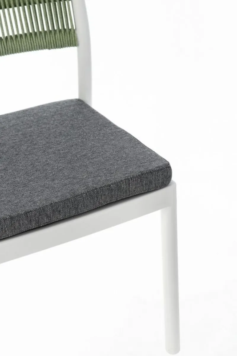 POLIPROPILENE (PP), RESISTENTE AI RAGGI UV. SCHIENALE CON INTRECCIO IN CORDA DI POLIESTERE. CUSCINO SEDUTA SFODERABILE CON TESSUTO IDROREPELLENTE POLIESTERE. IMPILABILE.