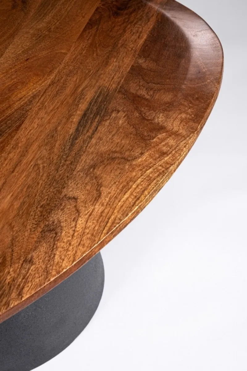 TOP IN LEGNO DI MANGO CON FORMA IRREGOLARE,CON VERNICIATURA A BASE D’ACQUA E FINITURA FINALE A BASE DI NITROCELLULOSA. BASE IN ACCIAIO VERNICIATO A POLVERE EPOSSIDICA EFFETTO MATERICO. BASE DA ASSEMBLARE
