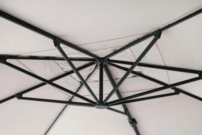 STRUTTURA IN ALLUMINIO VERNICIATA A POLVERE (POLIESTERE). PALO 102×65.5MM. 8 STECCHE 30X18.5MM. TELO COLOR NATURALE IN POLIESTERE 250GR/M2 CON RIVESTIMENTO IN PA (POLIAMMIDE) CON CAMINO ANTIVENTO. BASE A CROCE IN ACCIAIO. PALO GIREVOLE 360° MANUALMENTE. INCLINAZIONE VERTICALE CON IMPUGNATURA A 6 POSIZIONI. DOTATO DI SISTEMA PER INCLINAZIONE OMBRELLO DESTRA-SINISTRA. COMPRENSIVO DI