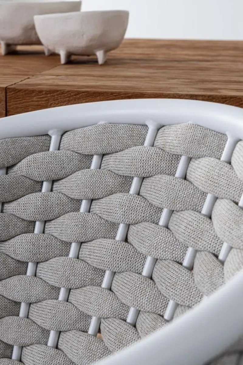 STRUTTURA IN ALLUMINIO VERNICIATA A POLVERE (POLIESTERE). INTRECCIO PER ESTERNO IN CORDA POLIESTERE IMBOTTITA IN GOMMA (POLIETILENE). CUSCINI SFODERABILI IN TESSUTO IDROREPELLENTE 100% POLIESTERE. IMPILABILE.