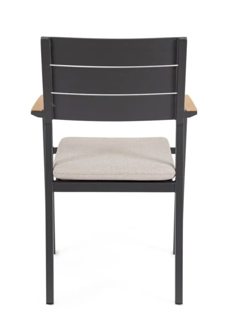STRUTTURA IN ALLUMINIO VERNICIATO A POLVERE (POLIESTERE). BRACCIOLI IN ALLUMINIO CON VERNICIATURA EFFETTO LEGNO. CUSCINO SEDUTA SFODERABILE CON TESSUTO IDROREPELLENTE OLEFIN (100% POLIPROPILENE). IMPILABILE.