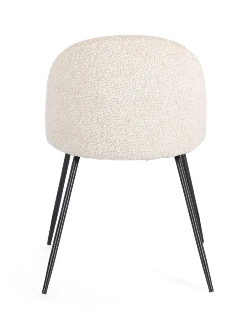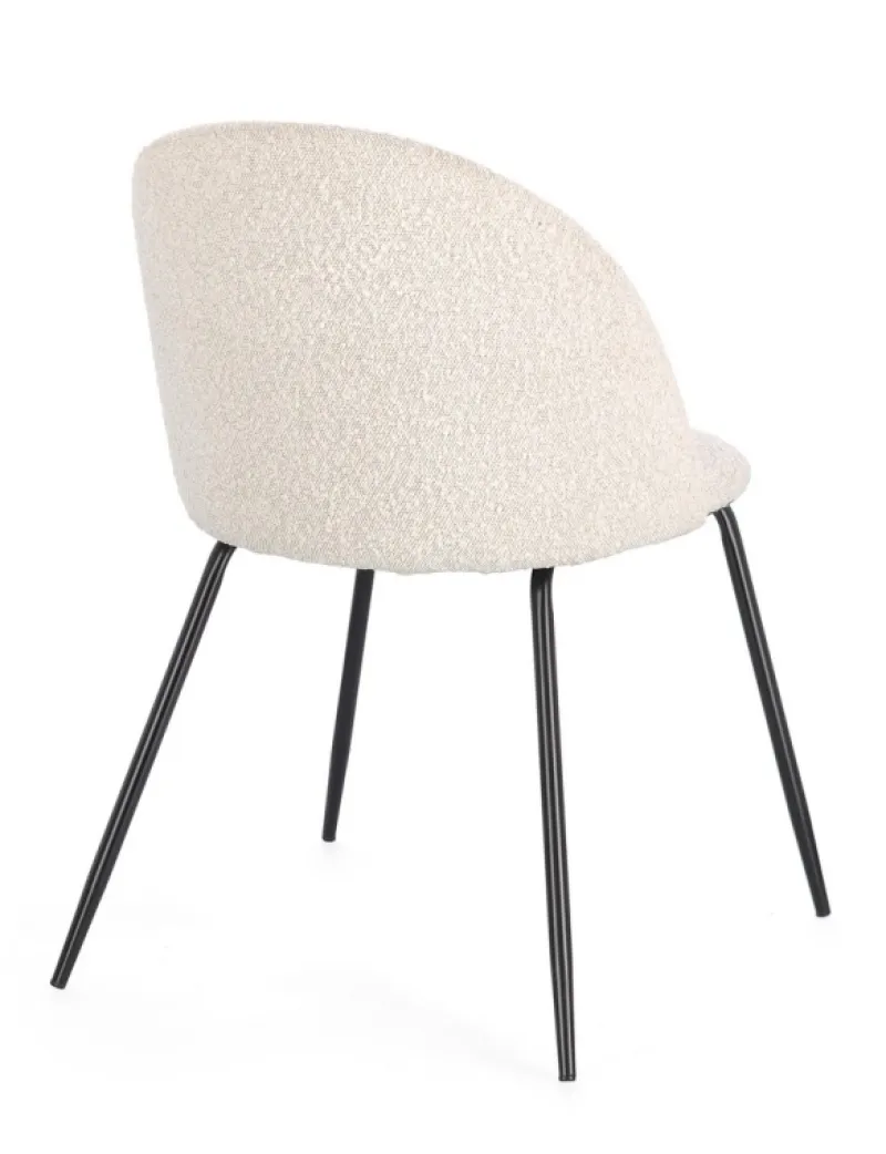 GAMBE IN TUBOLARE DI ACCIAIO CON CROMATURA COLOR NERO. SCHIENALE E SEDUTA IMBOTTITI IN SCHIUMA POLIURETANICA E RIVESTITI IN 95% POLIESTERE 5% ACRILICO EFFETTO BOUCLE’. GAMBE DA ASSEMBLARE.