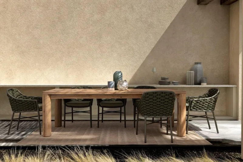 STRUTTURA IN ALLUMINIO VERNICIATO A POLVERE (POLIESTERE). INTRECCIO IN CORDA DI TEXTILENE CON IMBOTTITURA IN GOMMA NITRILICA. CUSCINO SEDUTA SFODERABILE IN TESSUTO IDROREPELLENTE OLEFIN (100% POLIPROPILENE). IMPILABILE.