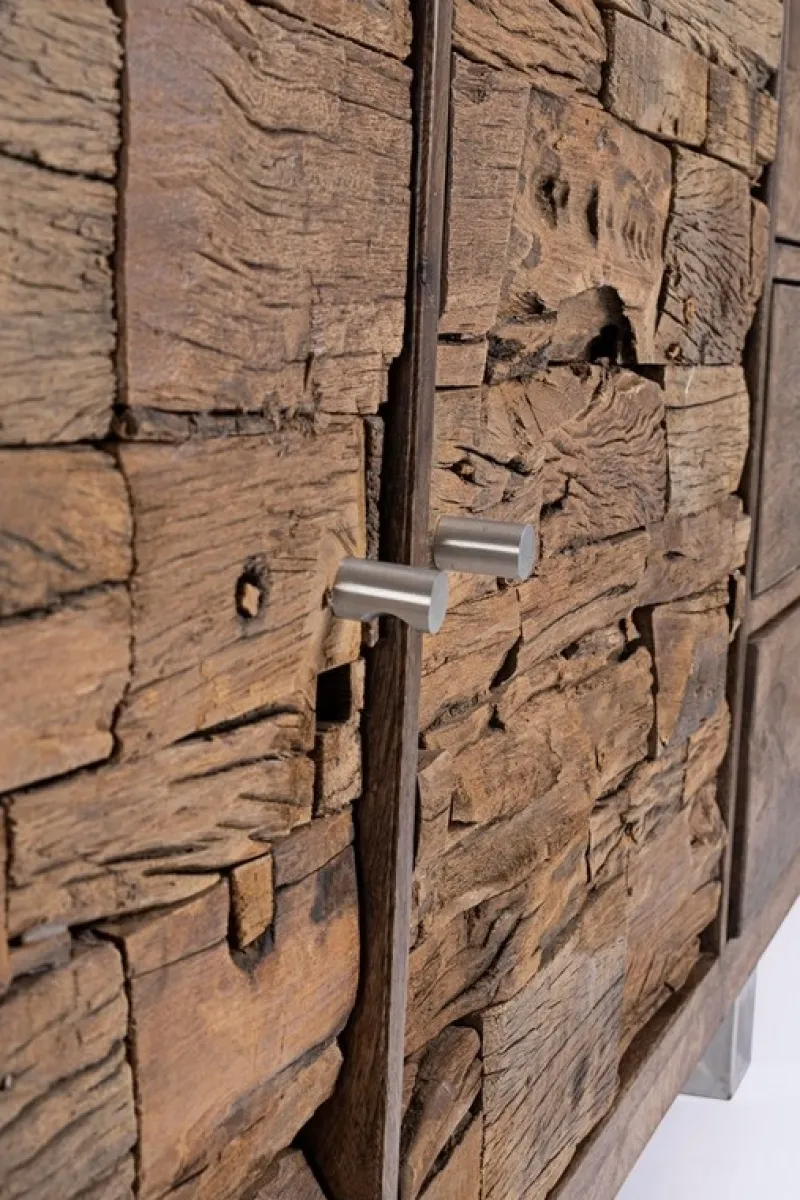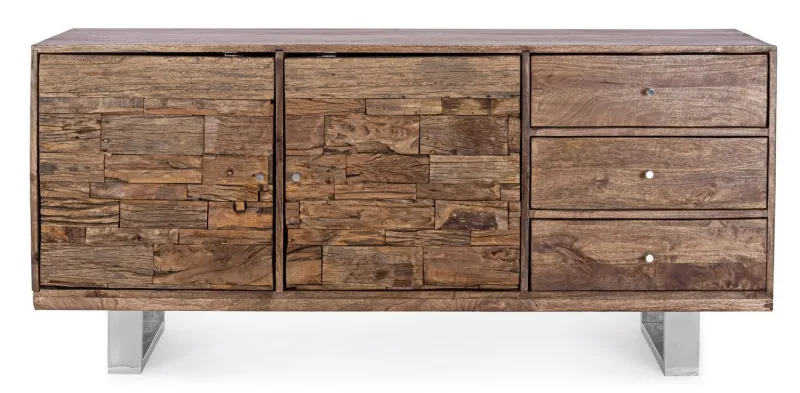 STRUTTURA IN LEGNO DI MANGO, FRONTALI IN LEGNO RICICLATO, SCHIENALI IN COMPENSATO. FINITURA A BASE DI NITROCELLULOSA. GAMBE IN ACCIAIO INOSSIDABILE. IL PRODOTTO IN LEGNO RICICLATO È CARATTERIZZATO DALLA PRESENZA DI TASSELLI IN LEGNO DI DIVERSE SPECIE E COLORE. EVENTUALI FESSURE, CREPE O IMPERFEZIONI, CHE POSSONO GENERARSI ANCHE NEL CORSO DEL TEMPO,