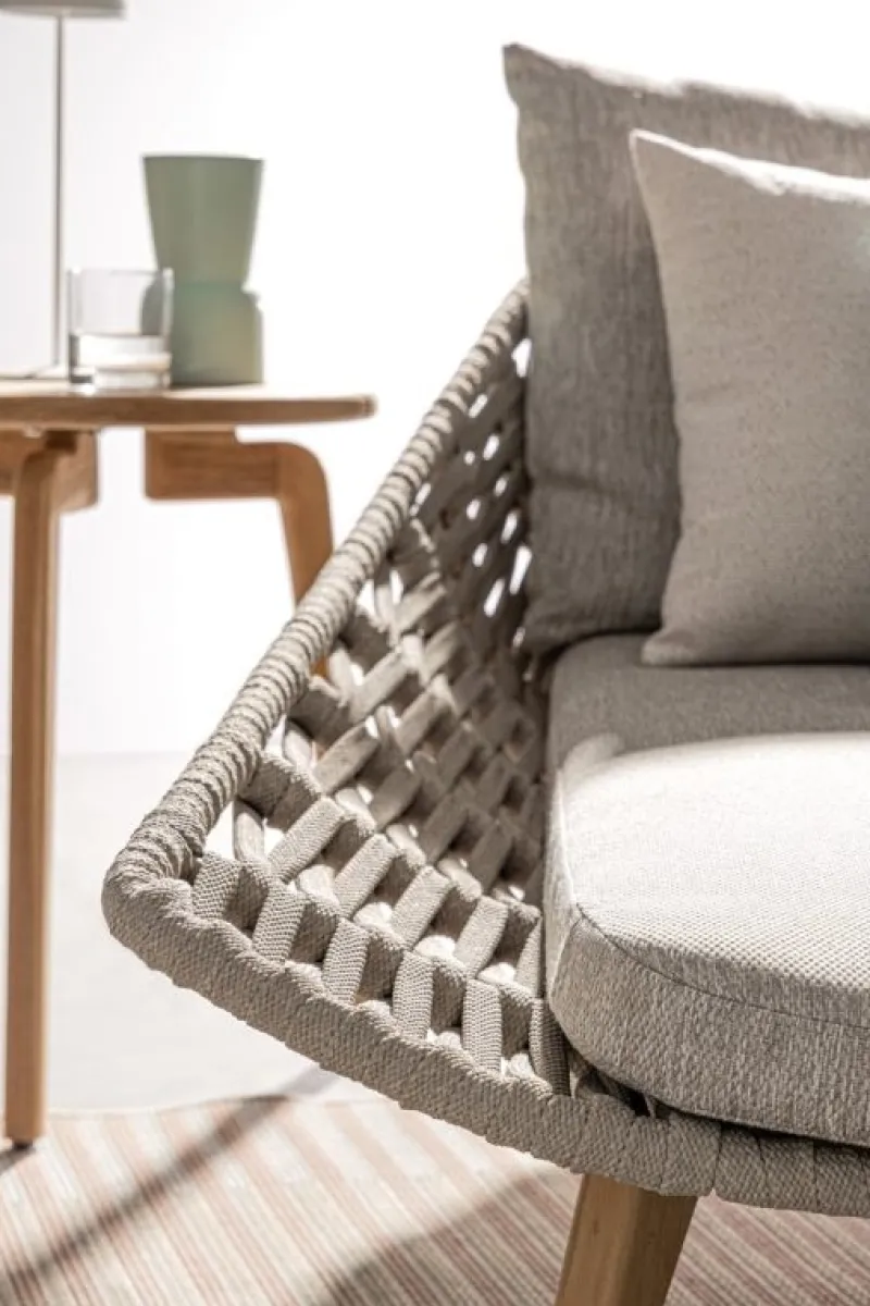 STRUTTURA IN ALLUMINIO VERNICIATA A POLVERE (POLIESTERE). GAMBE IN TEAK – SVLK (LEGNO CERTIFICATO PROVENIENTE DA FORESTE SOSTENIBILI). INTRECCIO PER ESTERNO IN CORDA (POLIPROPILENE). CUSCINI SFODERABILI IN TESSUTO IDROREPELLENTE SUNPROOF OLEFIN (100%POLYPROPYLENE). VITERIA IN ACCIAIO INOSSIDABILE. GAMBE DA ASSEMBLARE.