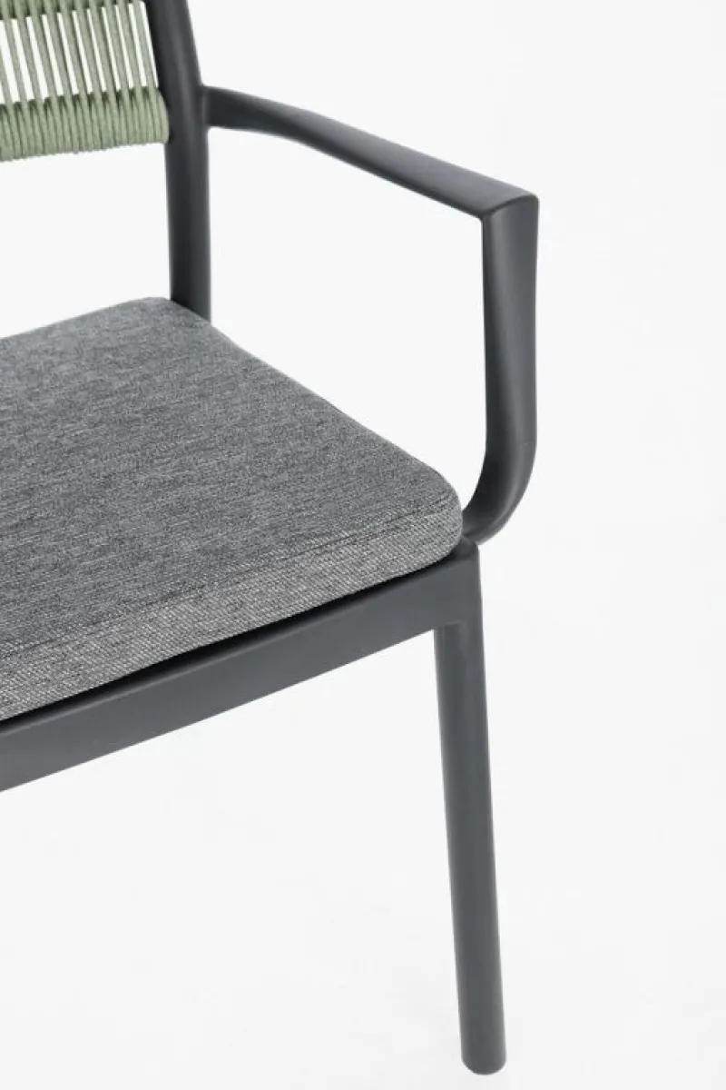 POLIPROPILENE (PP), RESISTENTE AI RAGGI UV. SCHIENALE CON INTRECCIO IN CORDA DI POLIESTERE. CUSCINO SEDUTA SFODERABILE CON TESSUTO IDROREPELLENTE POLIESTERE. IMPILABILE.