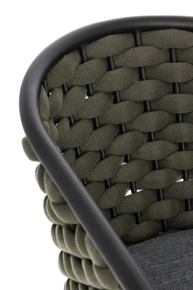 STRUTTURA IN ALLUMINIO VERNICIATA A POLVERE (POLIESTERE). INTRECCIO PER ESTERNO IN CORDA OLEFIN (POLIPROPILENE) IMBOTTITA IN GOMMA (POLIETILENE). CUSCINI SFODERABILI IN TESSUTO IDROREPELLENTE 100% POLIPROPILENE. IMPILABILE. IMBALLO SENZA CARTONE.