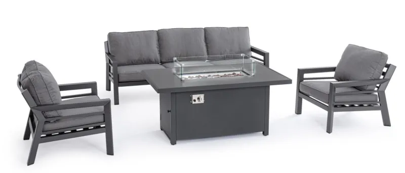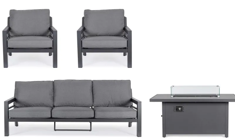 ALLUMINIO VERNICIATO A POLVERE (POLIESTERE). CUSCINI SFODERABILI CON TESSUTO IDROREPELLENTE 100% POLIESTERE. TAVOLO IN ALLUMINIO VERNICIATO A POLVERE (POLIESTERE) CON PIANO IN VETRO (SPESSORE 8MM) SERIGRAFATO EFFETTO CERAMICA E CAMINO CENTRALE A GAS. PARAVENTO PER CAMINO IN VETRO TEMPERATO E COPERCHIO IN ALLUMINIO. BRUCIATORE IN ACCIAIO INOSSIDABILE (#304). MANOPOLA DI