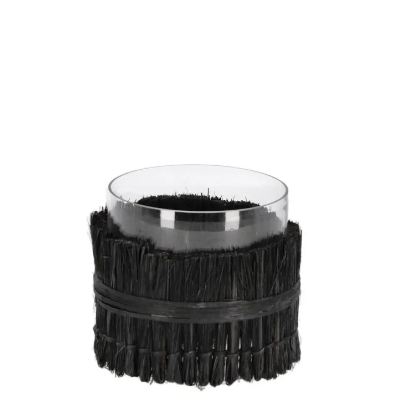 VETRO E RAFIA DA PALMA. PRODOTTO FATTO A MANO. EVENTUALI VARIAZIONI DI COLORE, TONALITÀ O IMPERFEZIONI SONO DA CONSIDERARSI UNA CARATTERISTICA DI UNICITÀ. IL MATERIALE NATURALE ESTERNO NON DEVE ESSERE POSTO A CONTATTO CON L’ACQUA. SOLO PER USO INTERNO.