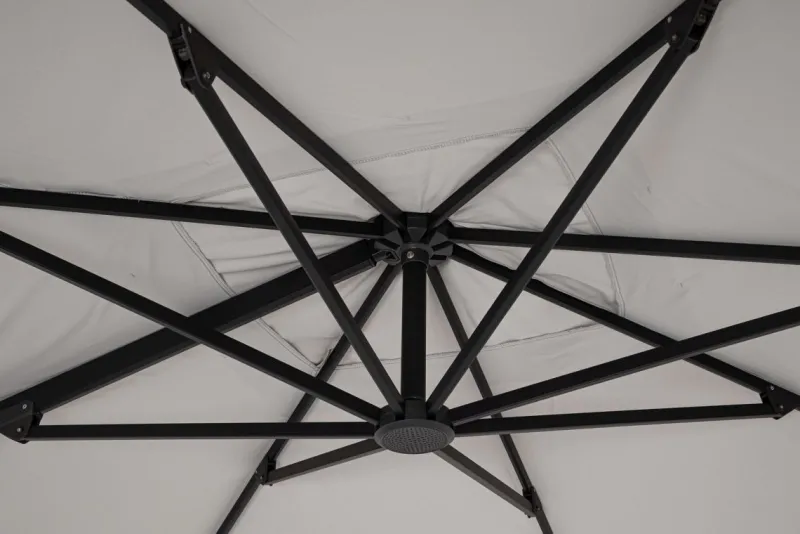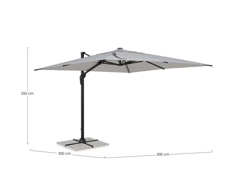 STRUTTURA IN ALLUMINIO VERNICIATA A POLVERE (POLIESTERE). PALO 55X82MM. 8 STECCHE 14.5X24MM. TELO GRIGIO CHIARO IN POLIESTERE 250GR/M2 CON RIVESTIMENTO IN PA (POLIAMMIDE) CON CAMINO ANTIVENTO. BASE A CROCE IN ACCIAIO. PALO GIREVOLE 360° CON PEDALINA. INCLINAZIONE VERTICALE CON IMPUGNATURA A 5 POSIZIONI. COMPRENSIVO DI COPRIOMBRELLONE. MARMETTE NON INCLUSE.