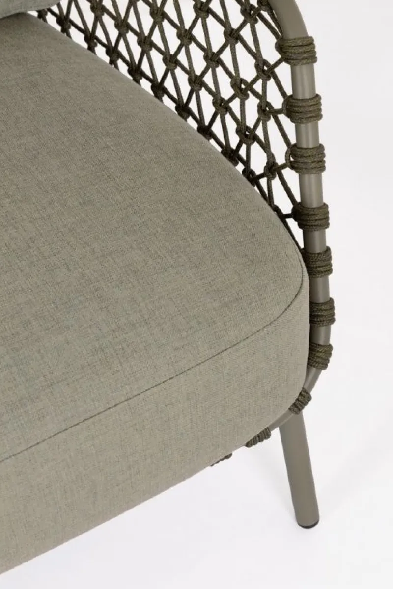 STRUTTURA IN ACCIAIO INOSSIDABILE (201). INTRECCIO PER ESTERNO IN CORDA (POLIPROPILENE). CUSCINI SFODERABILI IN TESSUTO IDROREPELLENTE SUNPROOF OLEFIN (100%POLYPROPYLENE).