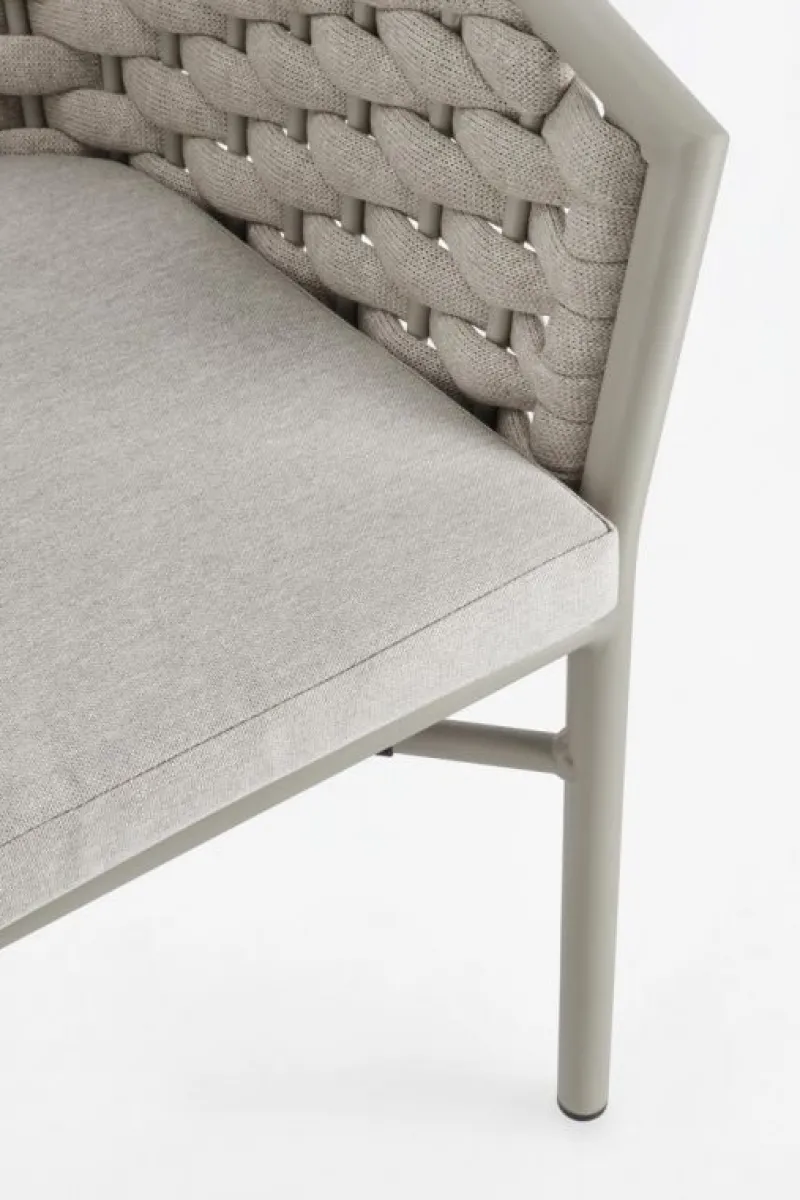STRUTTURA IN ALLUMINIO VERNICIATA A POLVERE (POLIESTERE). INTRECCIO PER ESTERNO IN CORDA POLIESTERE IMBOTTITA IN GOMMA (POLIETILENE). CUSCINI SFODERABILI IN TESSUTO IDROREPELLENTE 100% POLIESTERE. IMPILABILE. IMBALLO SENZA CARTONE.