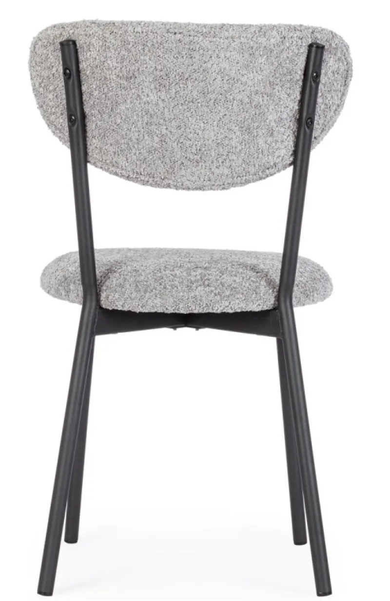 STRUTTURA IN ACCIAIO VERNICIATA A POLVERE EPOSSIDICA. SEDUTA E SCHIENALE IN COMPENSATO CON RIVESTIMENTO IN POLIESTERE, EFFETTO BOUCLE’. IMBOTTITURA IN SCHIUMA POLIURETANICA (DENSITA’ 25KG/M3). DA ASSEMBLARE.