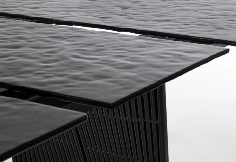 GAMBE IN ACCIAIO VERNICIATO A POLVERE EPOSSIDICA. PIANO IN VETRO (10MM) ALLUNGABILE CON EFFETTO BOCCIARDATO. GAMBE DA ASSEMBLARE.