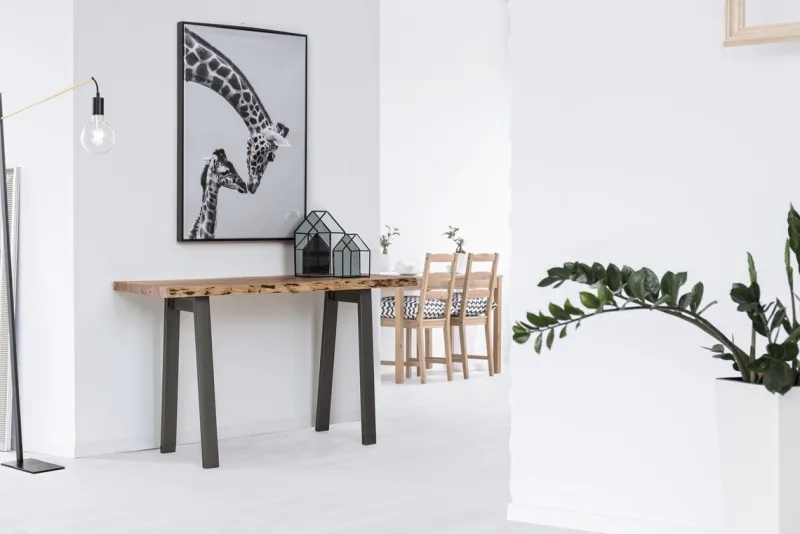 GAMBE IN ACCIAIO VERNICIATO A POLVERE EPOSSIDICA. PIANO IN LEGNO DI ACACIA CON BORDI IRREGOLARI (EFFETTO LEGNO VIVO). FINITURA A BASE DI VERNICE POLIURETANICA. ESSENDO UN PIANO LAVORATO A MANO, LE FORME E LE MISURE DEL LEGNO SONO SOLO INDICATIVE. TUTTI I PRODOTTI SARANNO DIVERSI L’UNO DALL’ALTRO. GAMBE DA ASSEMBLARE.