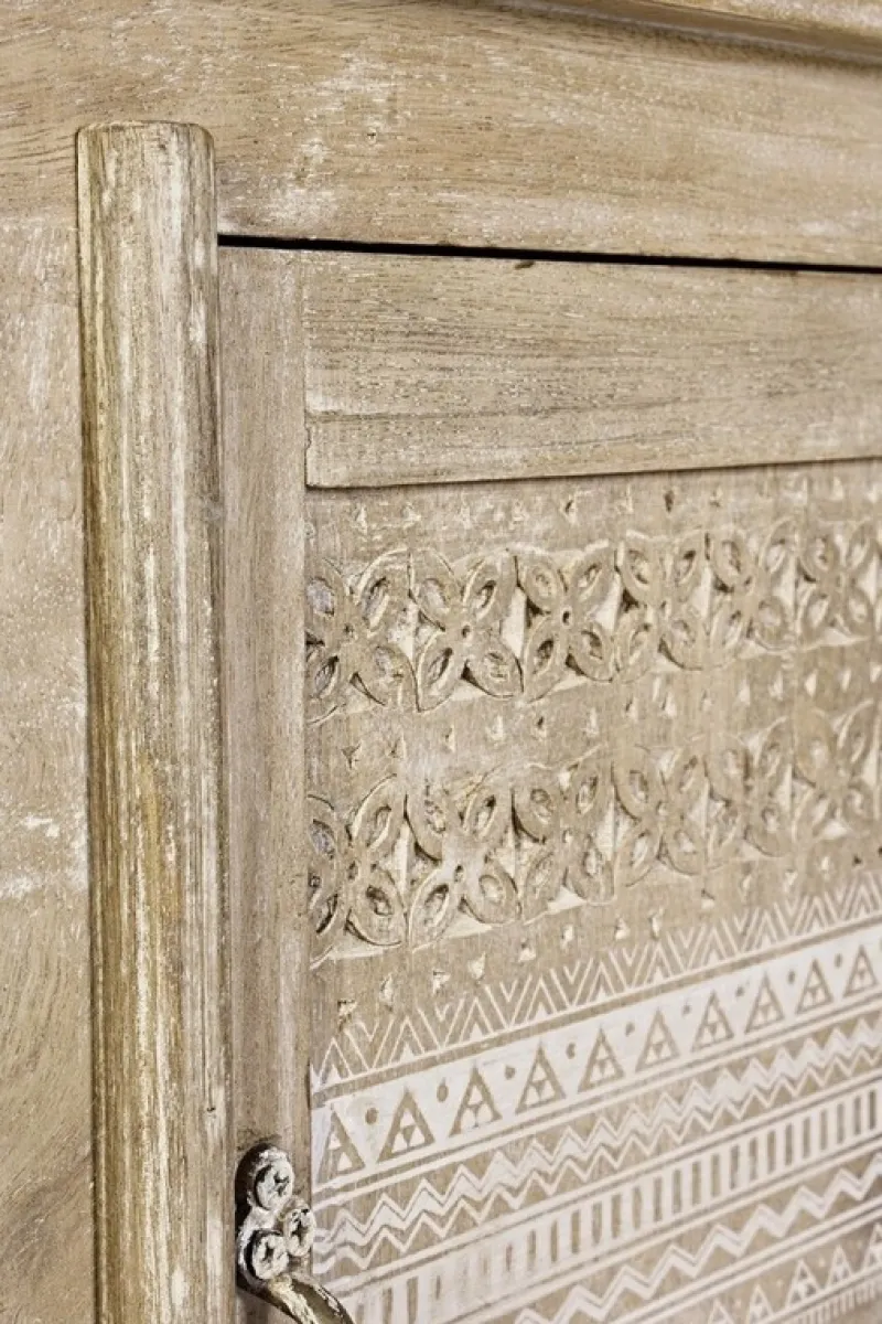 STRUTTURA IN LEGNO DI MANGO CON DECORAZIONI INTARSIATE A MANO, SCHIENALE IN MDF. FINITURA A BASE DI NITROCELLULOSA. MANIGLIE IN OTTONE.