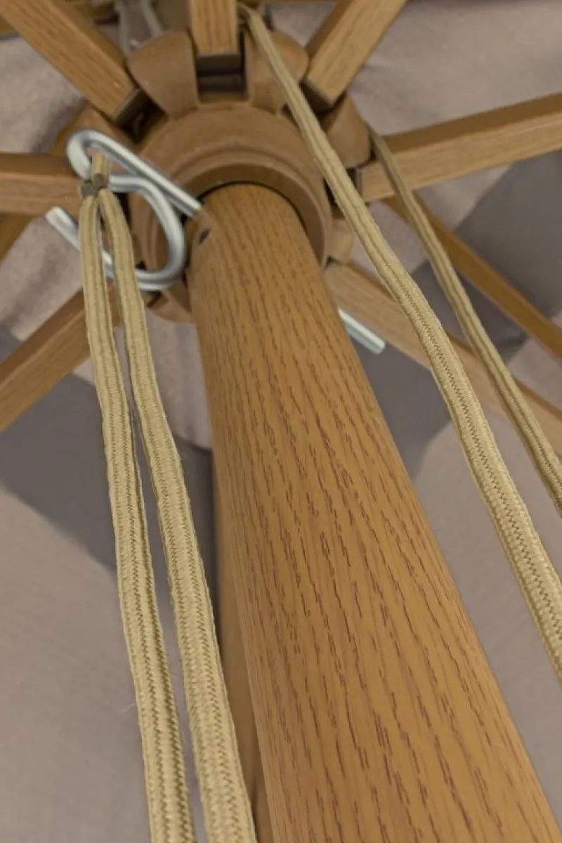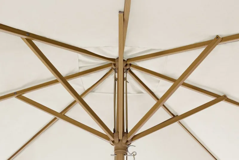 STRUTTURA IN ALLUMINIO FINITURA EFFETTO LEGNO. CORONA IN PLASTICA. PALOØ48×1.8MM. 8 STECCHE 20X30MM. TELO COLOR NATURALE IN POLIESTERE 235GR/M2 CON CAMINO ANTIVENTO. BASE NON INCLUSA.