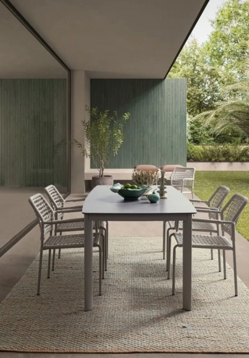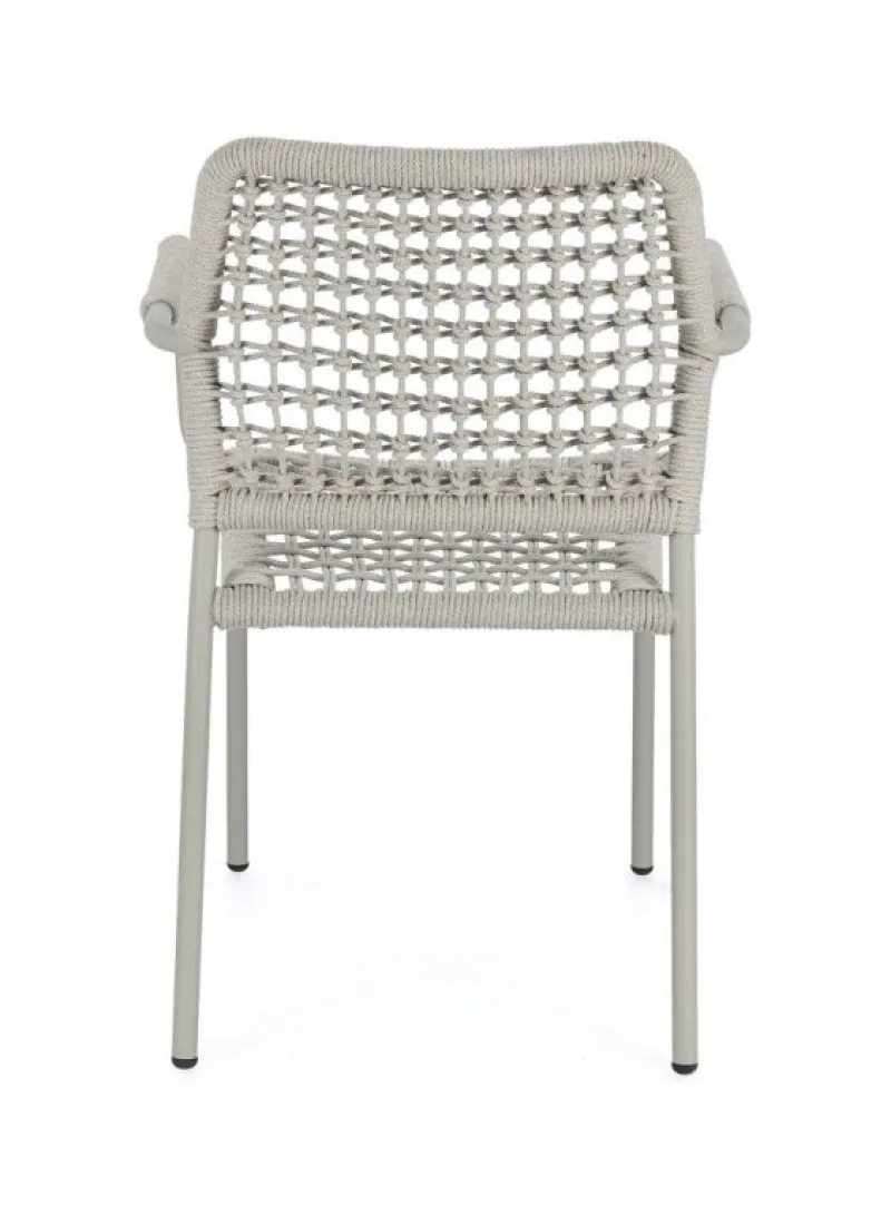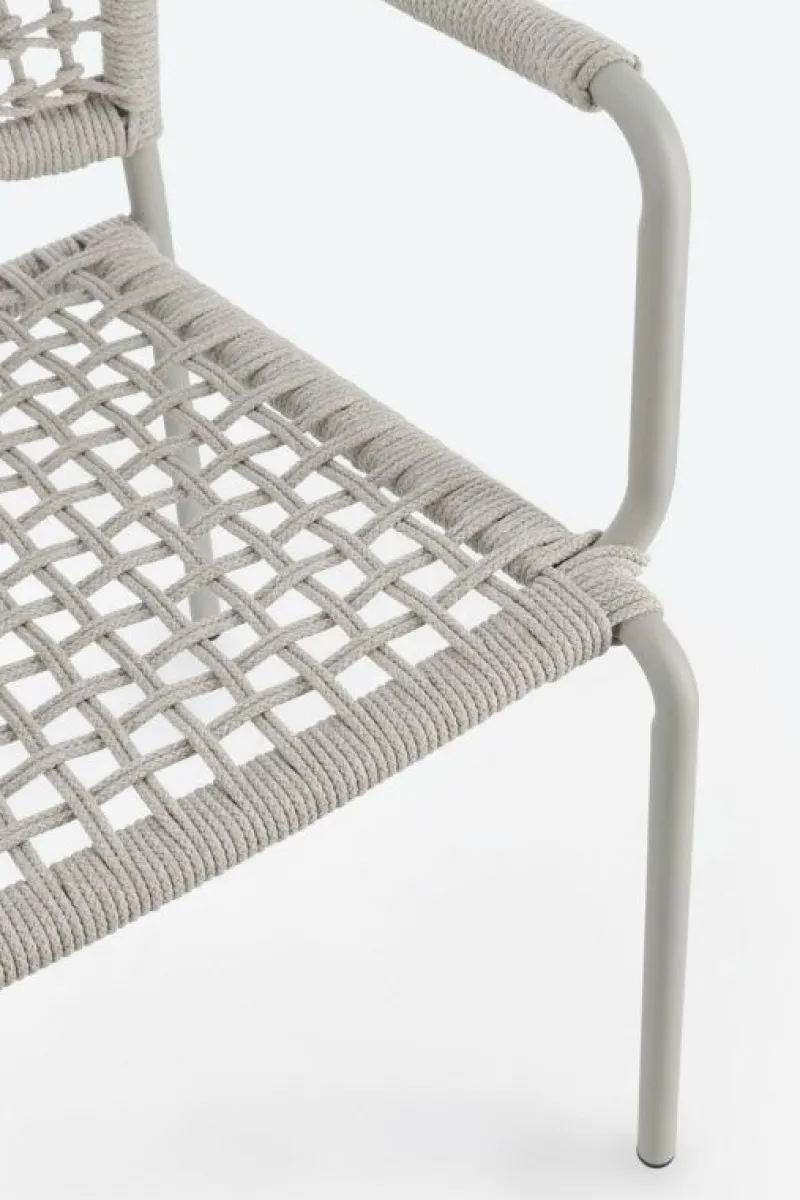 STRUTTURA IN ALLUMINIO VERNICIATA A POLVERE (POLIESTERE). INTRECCIO PER ESTERNO IN CORDA POLIESTERE. IMPILABILE.