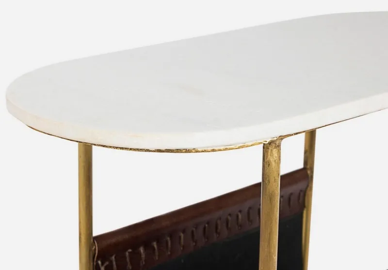 STRUTTURA IN ACCIAIO CON FINITURA OTTONATA. PIANO IN MARMO. PORTA RIVISTE IN VERA PELLE.