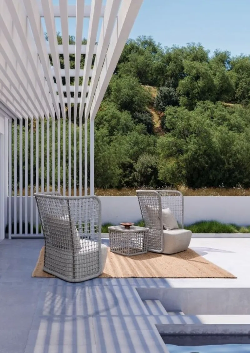 STRUTTURA IN ALLUMINIO VERNICIATO A POLVERE (POLIESTERE). INTRECCIO IN CORDA OLEFIN (100% POLIPROPILENE).