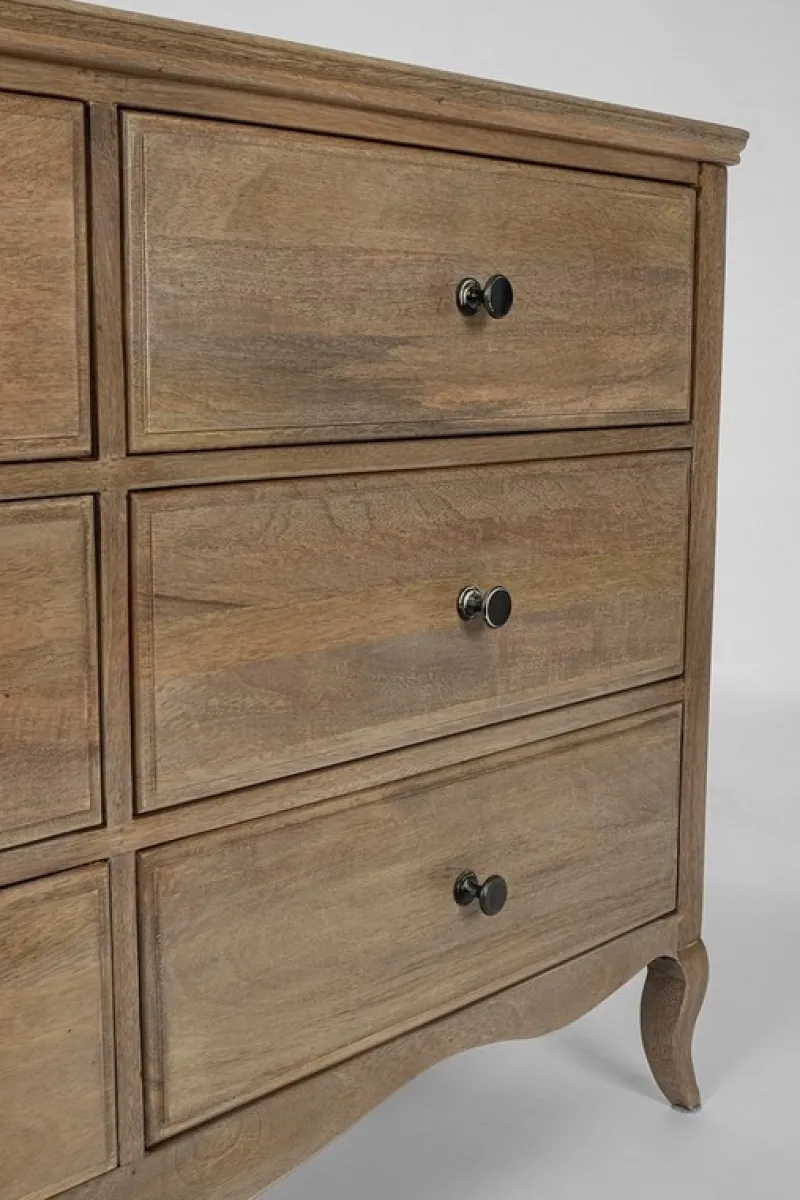STRUTTURA IN LEGNO DI MANGO, SCHIENALE E FONDO CASSETTI IN MDF. FINITURA CON VERNICE A BASE D’ACQUA. MANIGLIE IN GHISA.