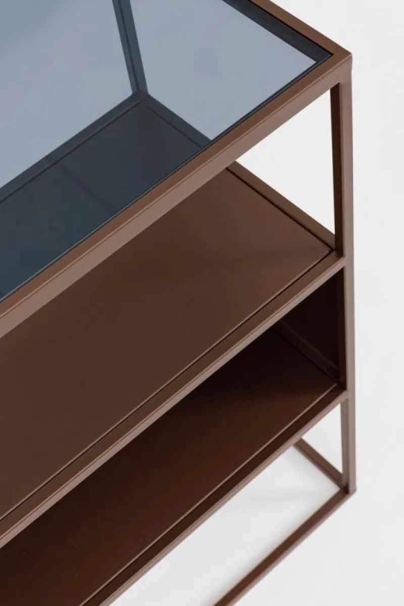STRUTTURA IN ACCIAIO VERNICIATO A POLVERE EPOSSIDICA. PIANO SUPERIORE IN VETRO TEMPERATO, PIANO INFERIORE IN ACCIAIO.