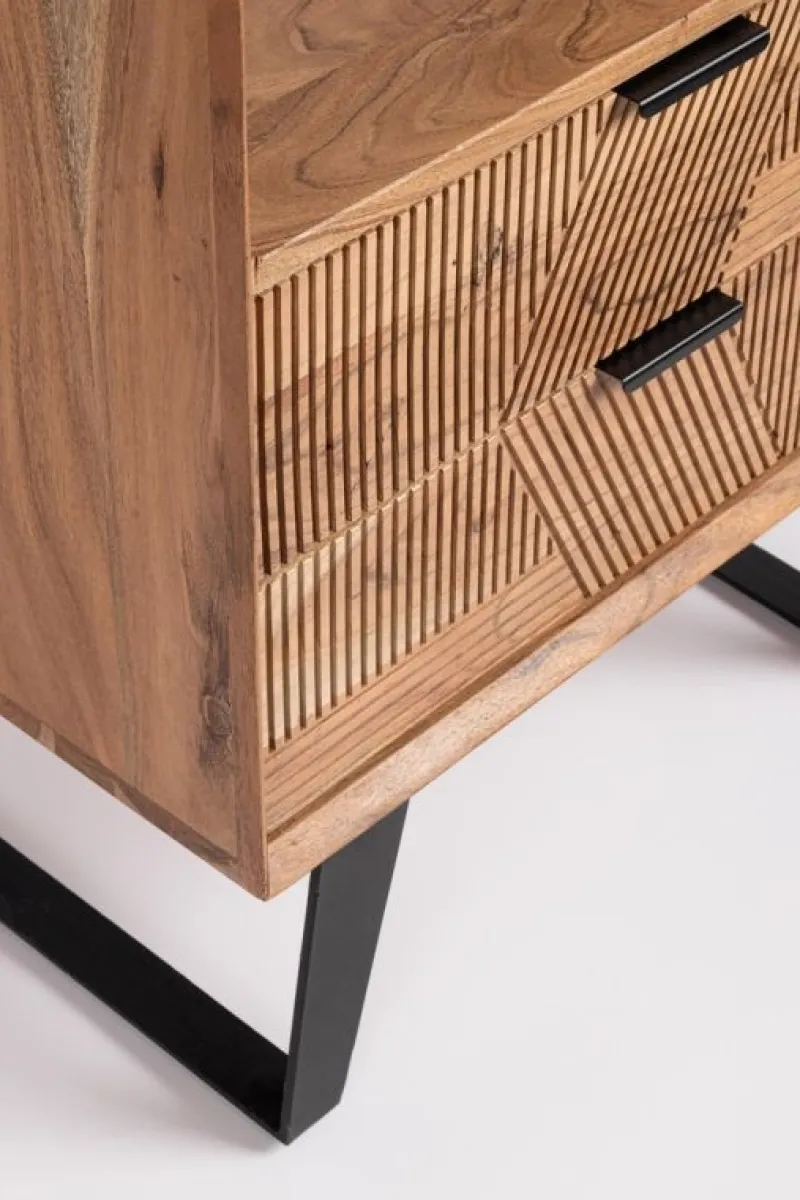 STRUTTURA IN LEGNO DI ACACIA, SCHIENALI E FONDO CASSETTI IN COMPENSATO. FRONTALI CASSETTI INTARSIATI E LAVORATI A MANO. FINITURA ACRILICA PROTETTIVA. MANIGLIE E GAMBE IN ACCIAIO. GAMBE DA ASSEMBLARE.