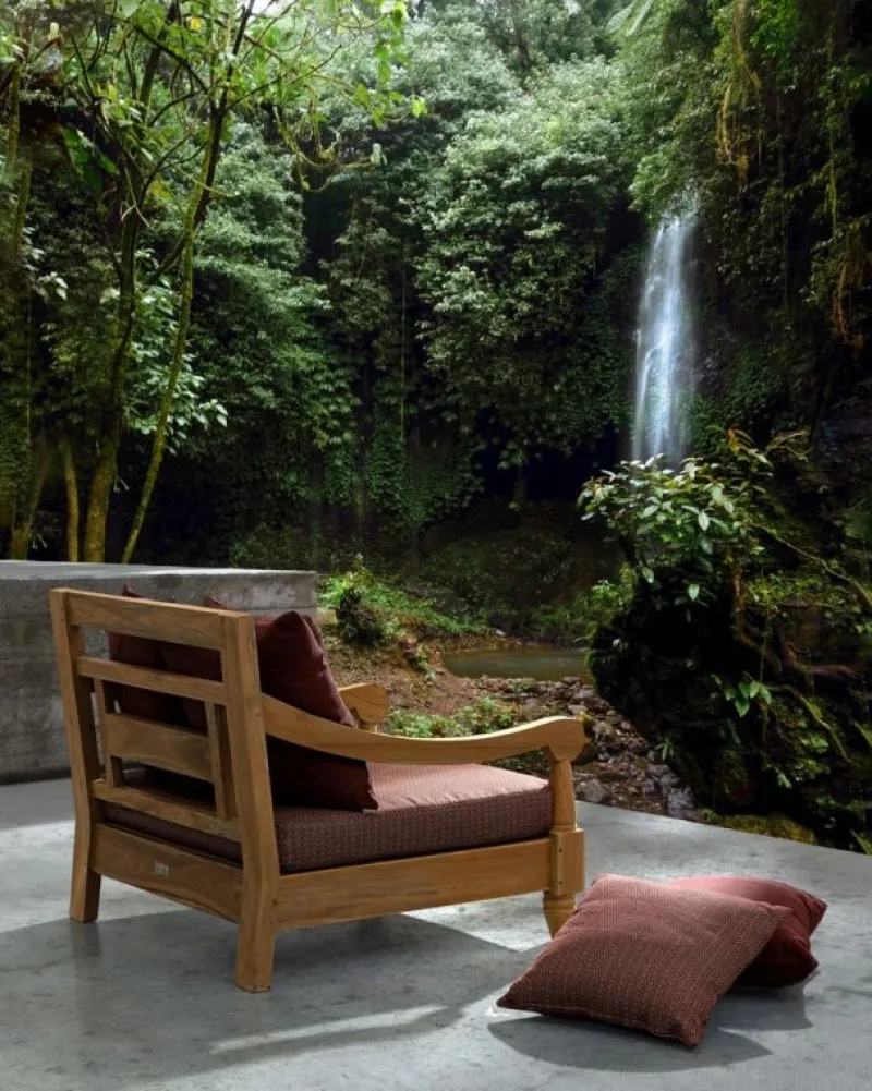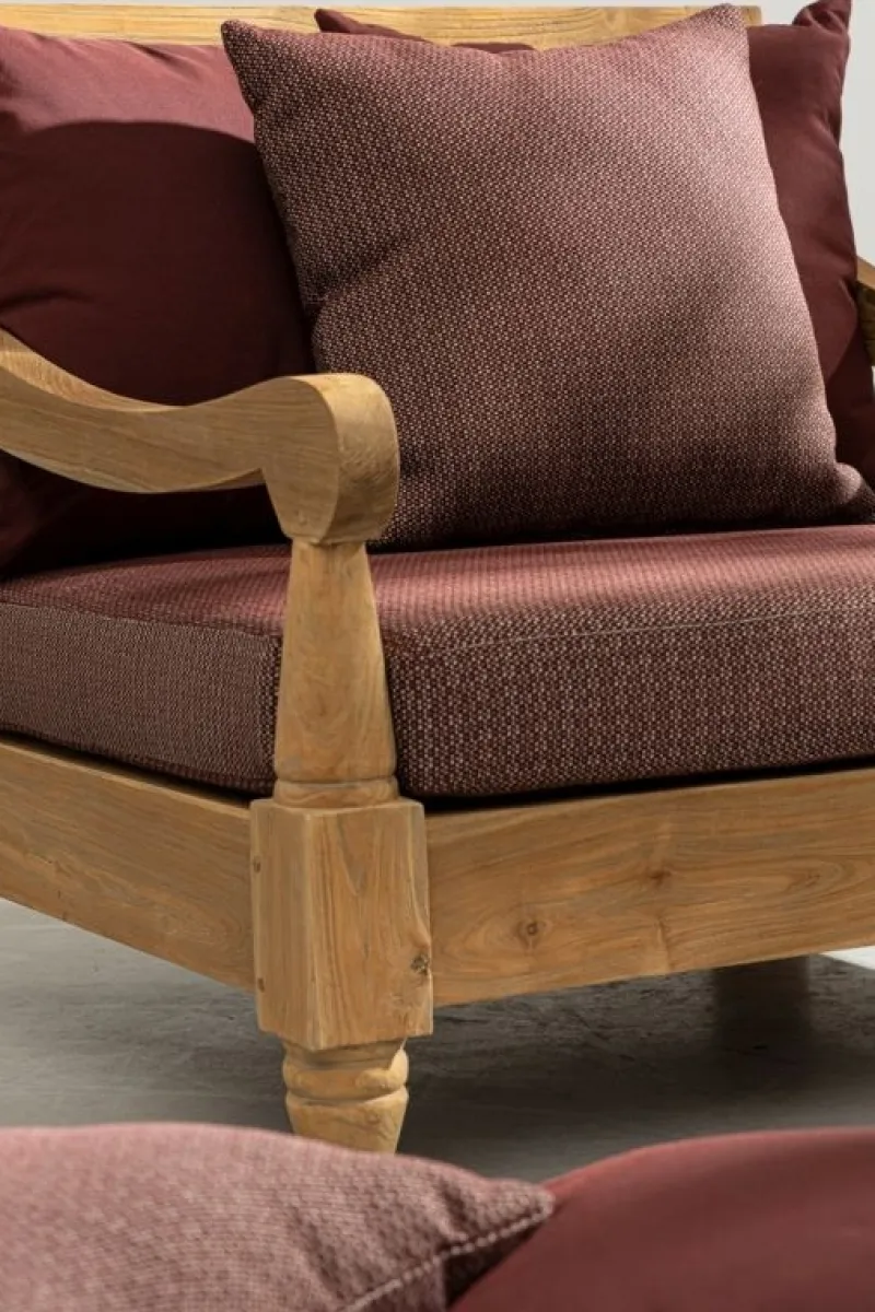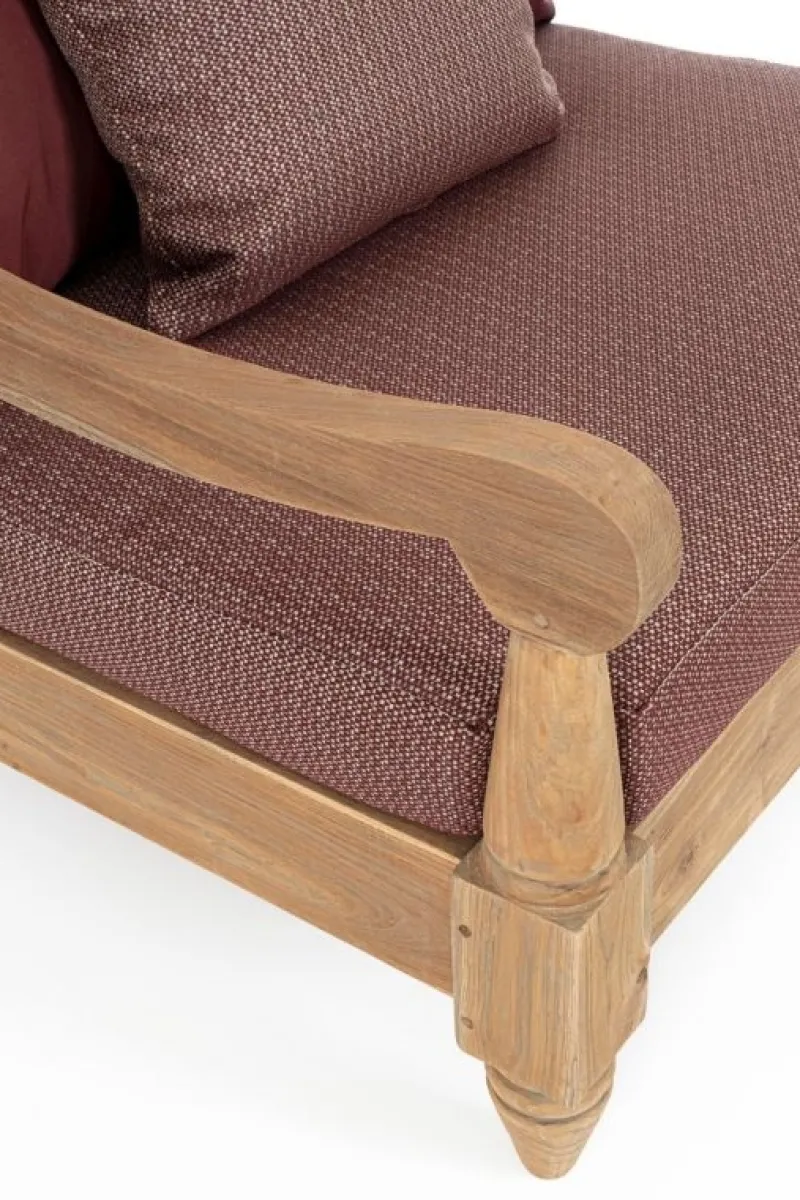 LEGNO TEAK FSC 100%, FINITURA SABBIATA ED ANTICATA A BASE D’ACQUA. CUSCINI SFODERABILI IN TESSUTO IDROREPELLENTE SUNPROOF OLEFIN (100% POLIPROPILENE). SI RACCOMANDA DI NON ESPORRE L’ARTICOLO ALLA LUCE DIRETTA DEL SOLE ED ALLE INTEMPERIE. QUESTO PRODOTTO È CARATTERIZZATO DALLA PRESENZA DI TASSELLI IN LEGNO DELLA STESSA NATURA. EVENTUALI FESSURE, CREPE O IMPERFEZIONI,