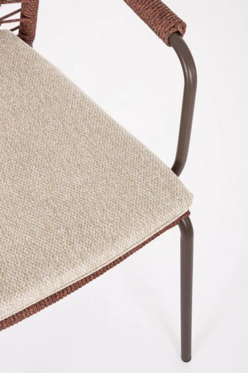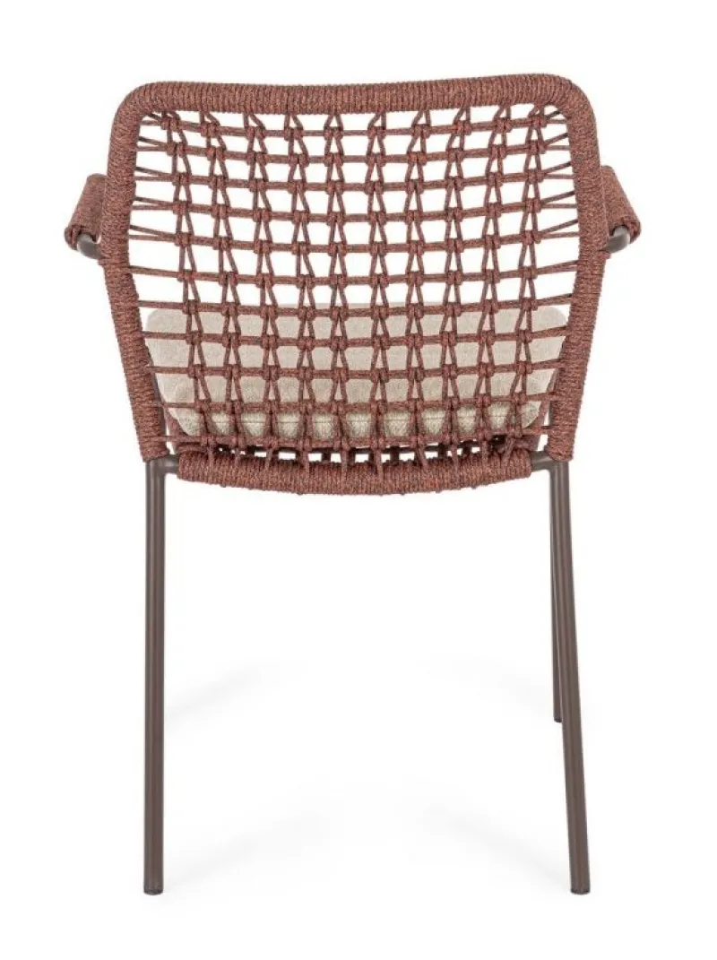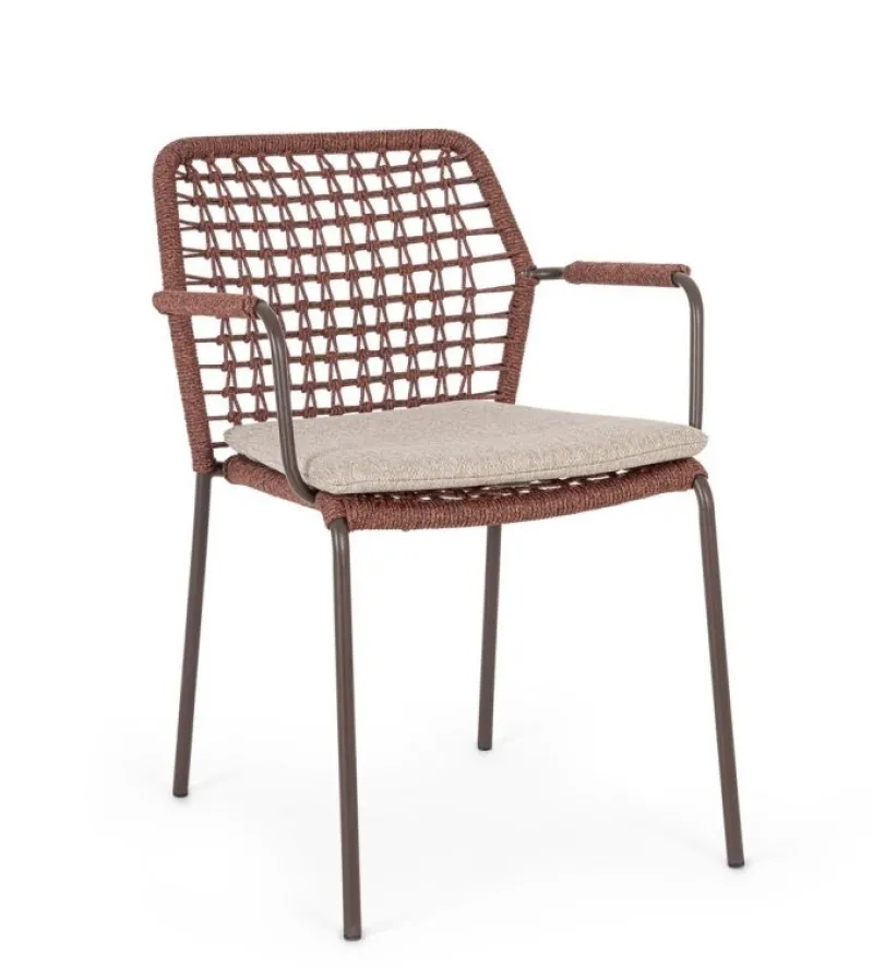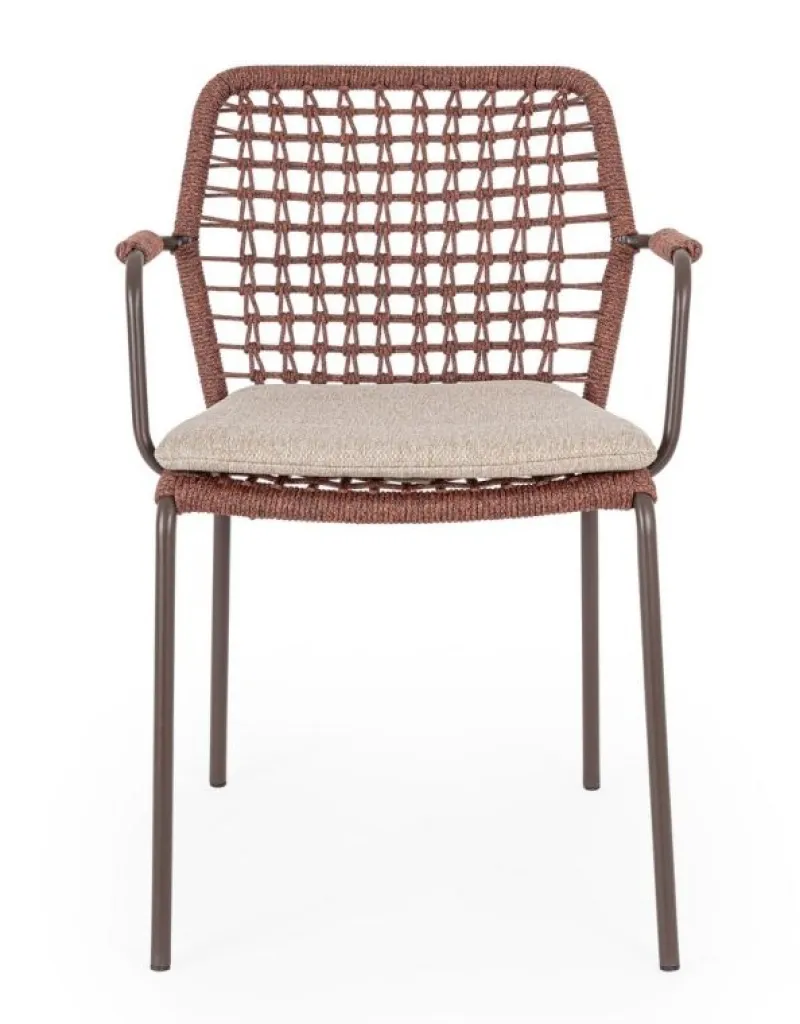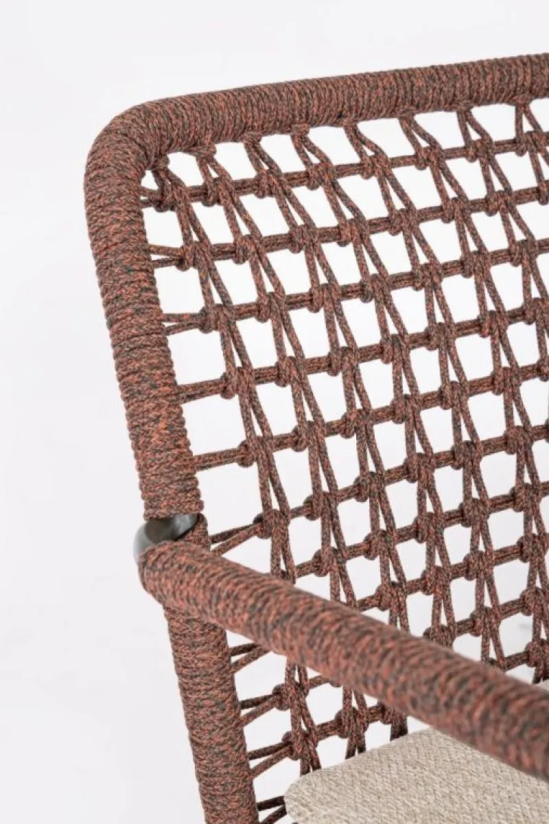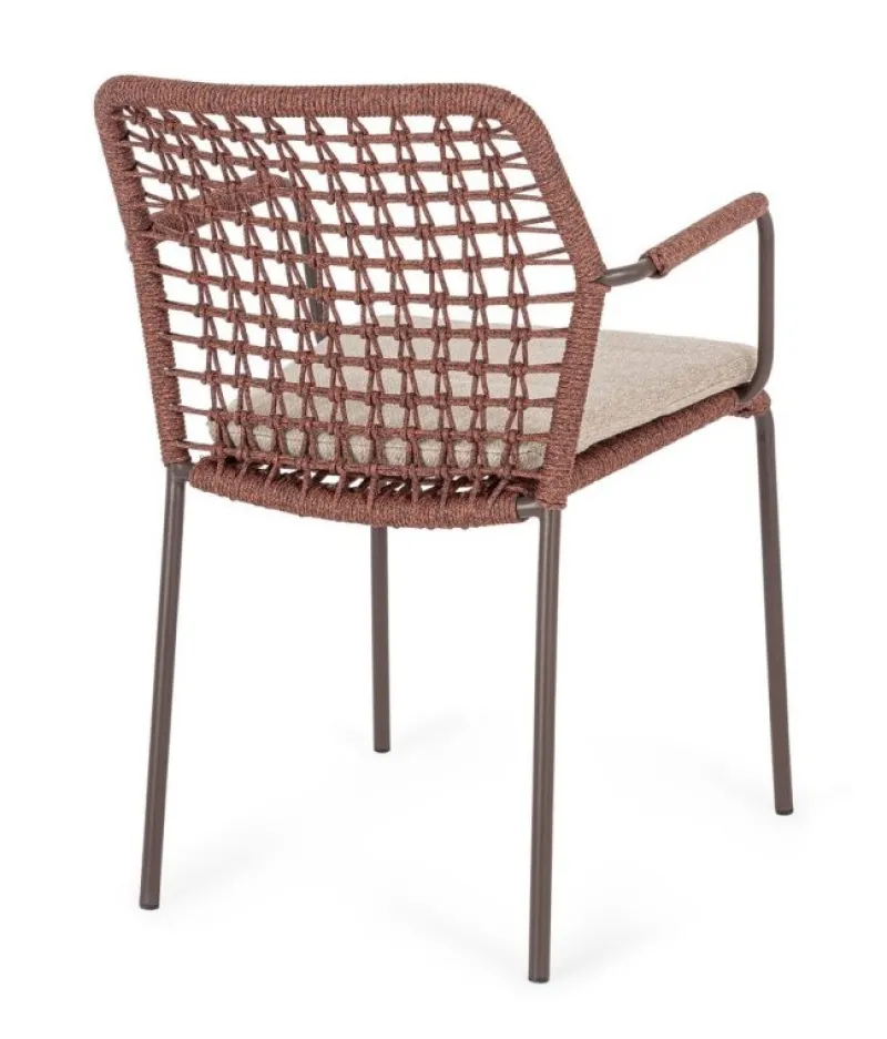 STRUTTURA IN ACCIAIO INOSSIDABILE (201). INTRECCIO PER ESTERNO IN CORDA (POLIPROPILENE). CUSCINI SFODERABILI IN TESSUTO IDROREPELLENTE SUNPROOF OLEFIN (100%POLYPROPYLENE). IMPILABILE.