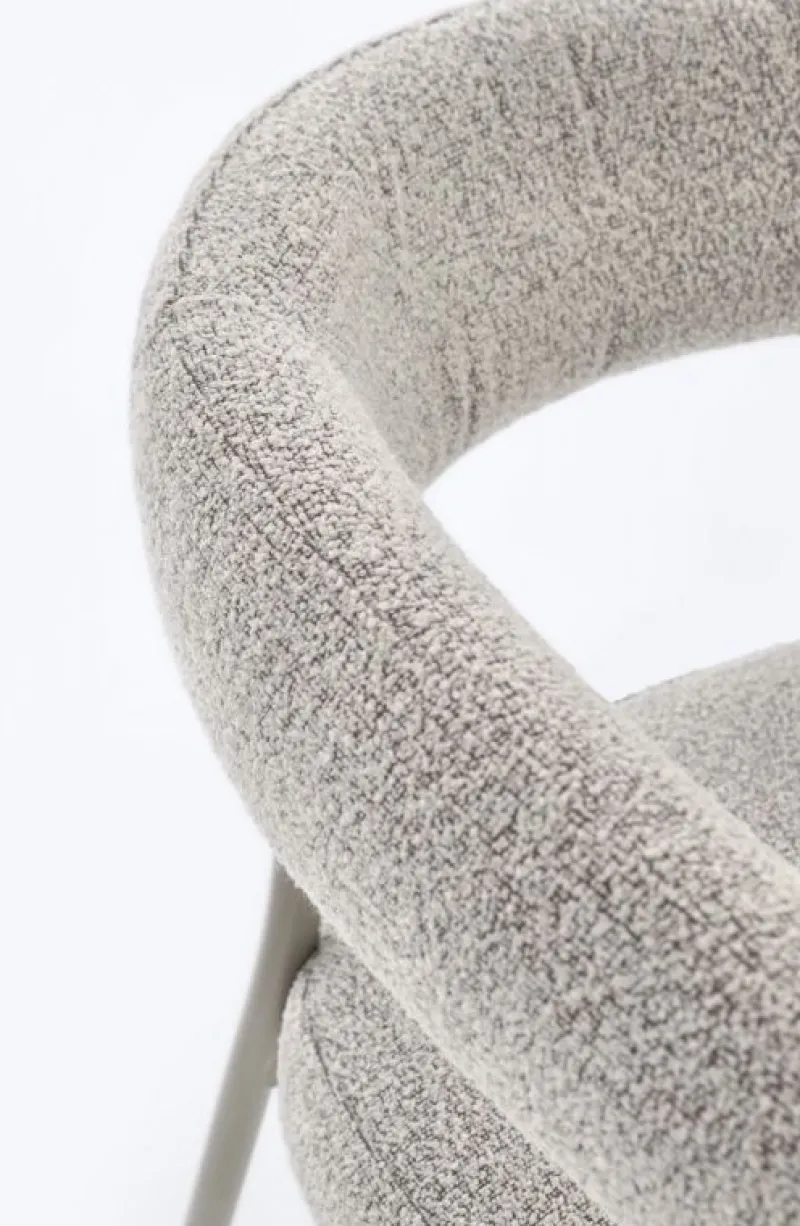 STRUTTURA IN COMPENSATO. GAMBE IN ACCIAIO VERNICIATO A POLVERE. IMBOTTITURA IN SCHIUMA POLIURETANICA DENSITA’ 22 KG/M3. RIVESTIMENTO IN POLIESTERE EFFETTO BOUCLE’ . DA ASSEMBLARE.
