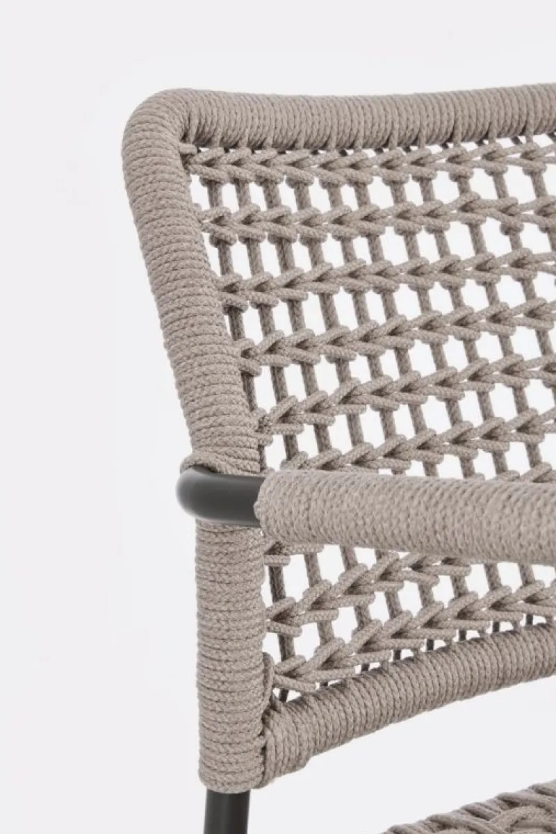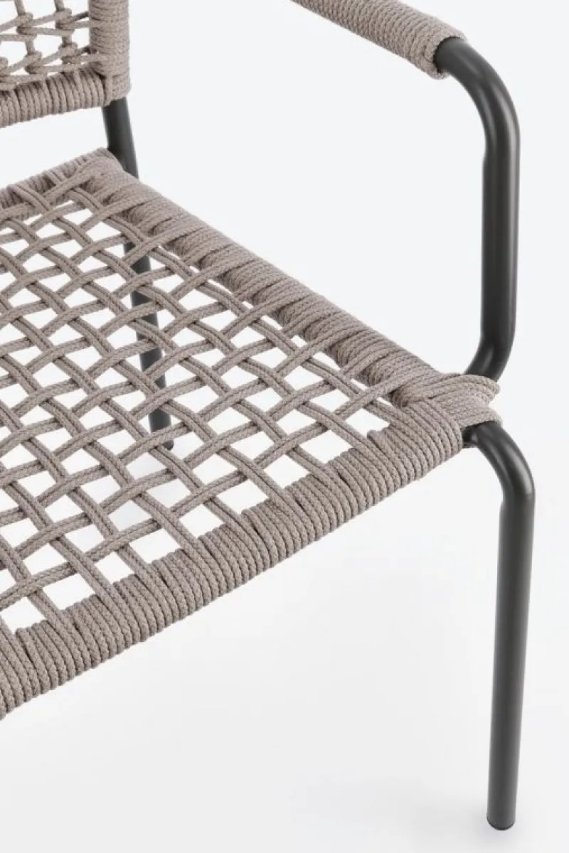 STRUTTURA IN ALLUMINIO VERNICIATA A POLVERE (POLIESTERE). INTRECCIO PER ESTERNO IN CORDA POLIESTERE. IMPILABILE. IMBALLO SENZA CARTONE.