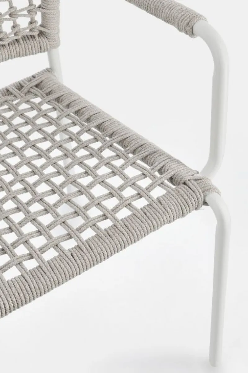 STRUTTURA IN ALLUMINIO VERNICIATA A POLVERE (POLIESTERE). INTRECCIO PER ESTERNO IN CORDA POLIESTERE. IMPILABILE. IMBALLO SENZA CARTONE.