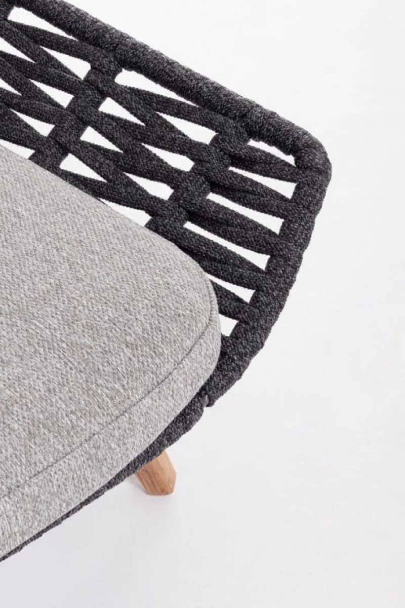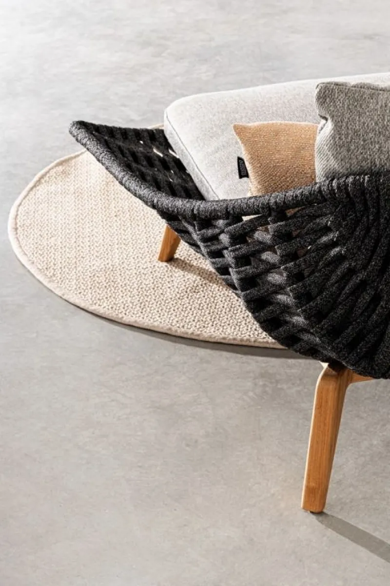 STRUTTURA IN ALLUMINIO VERNICIATA A POLVERE (POLIESTERE). GAMBE IN TEAK – SVLK (LEGNO CERTIFICATO PROVENIENTE DA FORESTE SOSTENIBILI). INTRECCIO PER ESTERNO IN CORDA (POLIPROPILENE). CUSCINI SFODERABILI IN TESSUTO IDROREPELLENTE SUNPROOF OLEFIN (100%POLYPROPYLENE). VITERIA IN ACCIAIO INOSSIDABILE. GAMBE DA ASSEMBLARE.