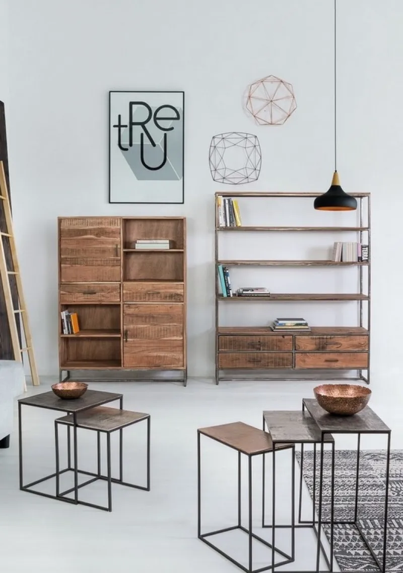 STRUTTURA IN ACCIAIO VERNICIATO A POLVERE EPOSSIDICA, PIANI E CASSETTI IN LEGNO D’ACACIA, SCHIENALI IN COMPENSATO. FINITURA ACRILICA PROTETTIVA.