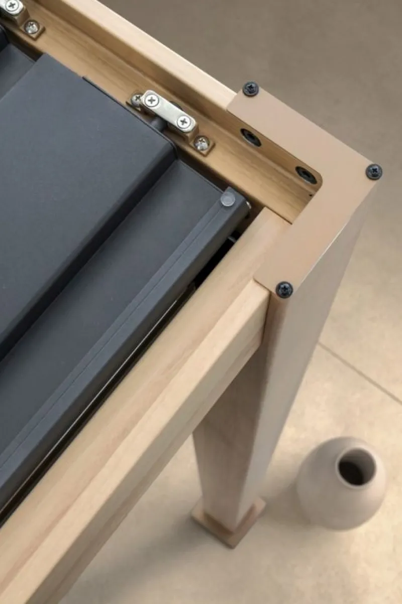 STRUTTURA IN ALLUMINIO. PALI PORTANTI 111X111MM, TRAVERSI 140X75MM. TETTO LAMELLARE VERNICIATO A POLVERE (POLIESTERE),ORIENTABILE TRAMITE MANOVELLA. LAME FRANGISOLE A DOPPIO STRATO 173X30MM. PALI PORTANTI E TRAVERSI CON APPLICAZIONE DI FILM IN PVC (FOGLIO LAMINATO AD ALTA TECNOLOGIA) STAMPATO IN 3D EFFETTO LEGNO VENATO.
